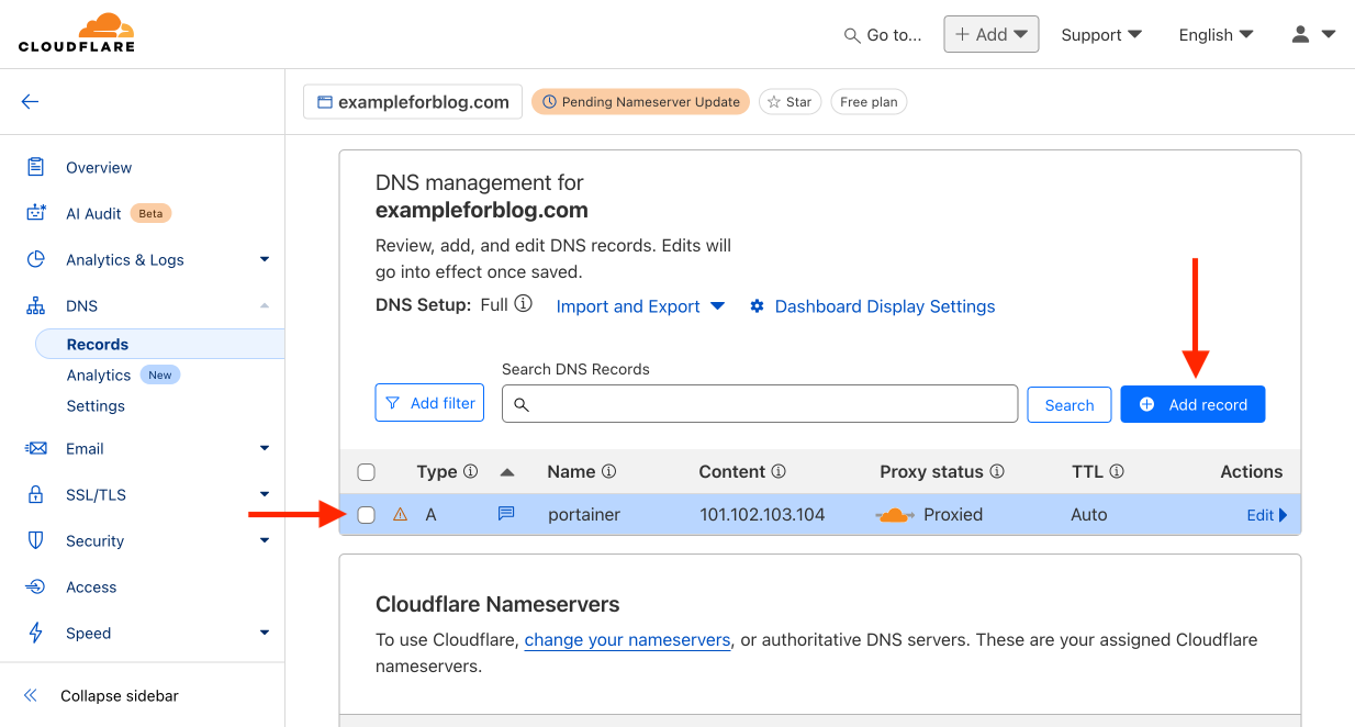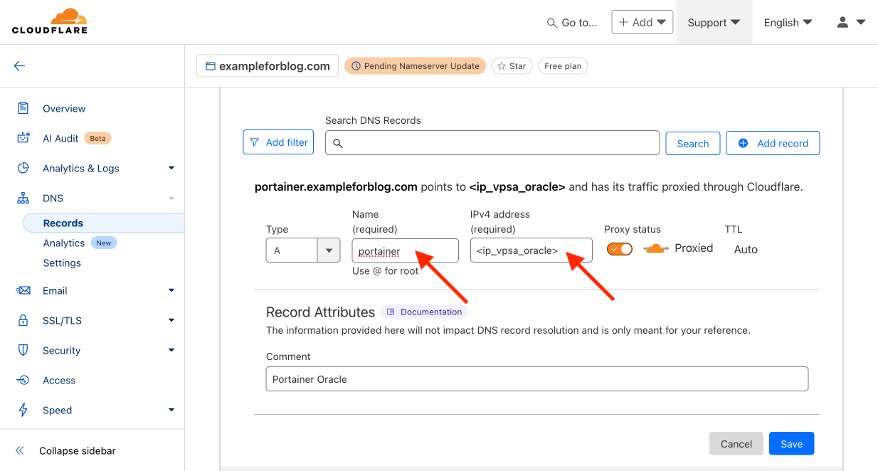 Teraz możemy już potwierdzić przyciskiem Save. Robimy to samo analogicznie jeszcze dwa razy dla dwóch pozostałych subdomen, które utworzyliśmy w Cloudflare.
