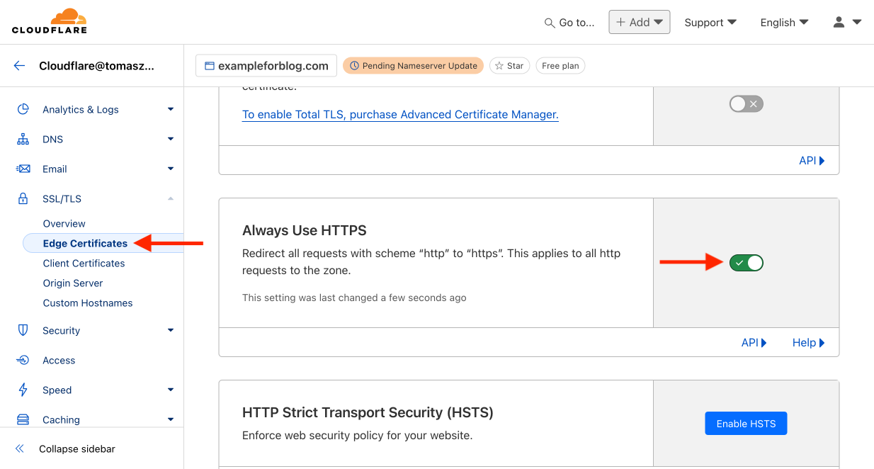 W ramach tej samej zakładki z menu po lewej wybieramy Edge Certificates. Odnajdujemy okienko podpisane Always Use HTTPS i włączamy tą funkcję.