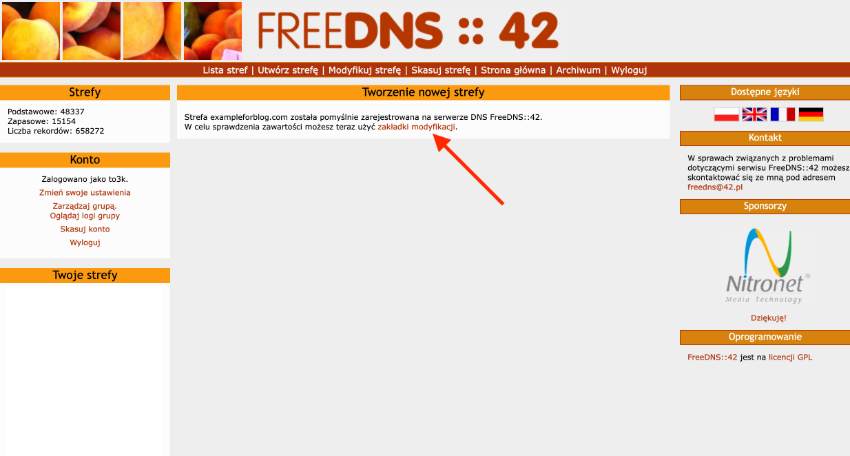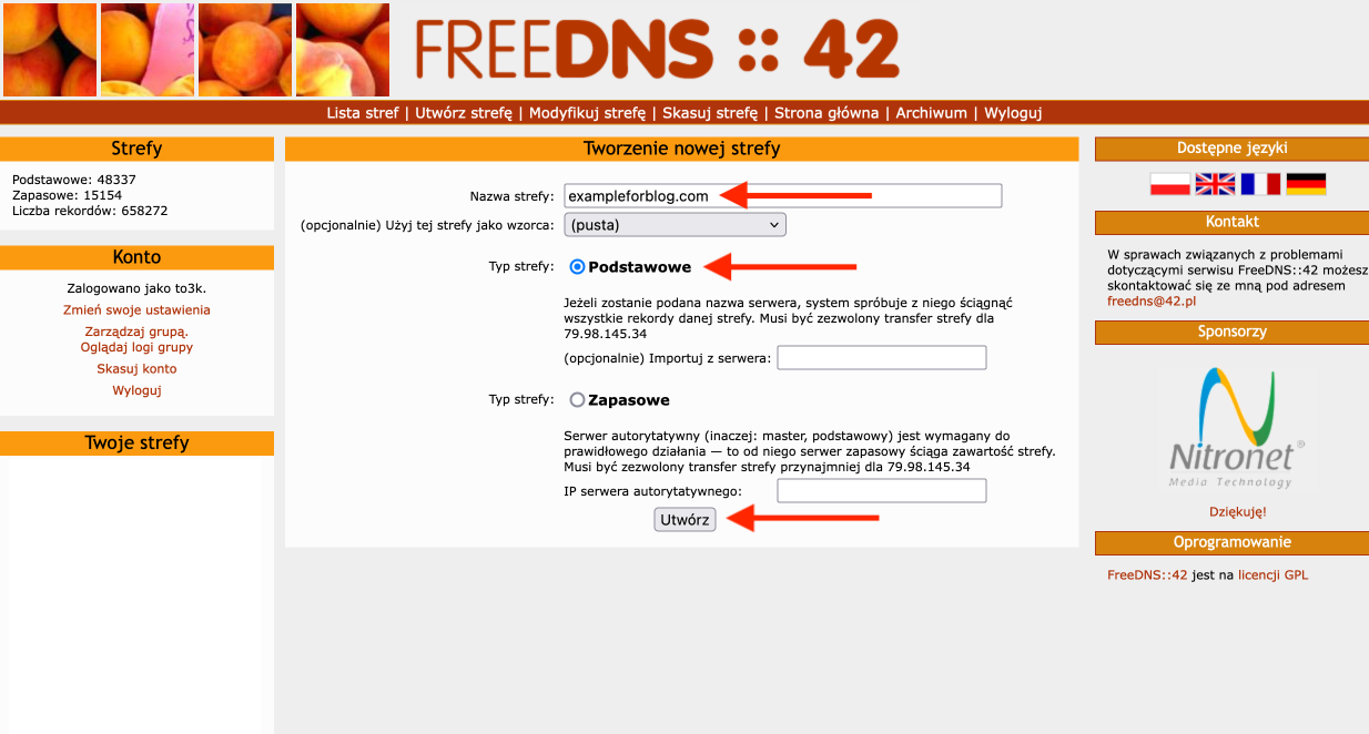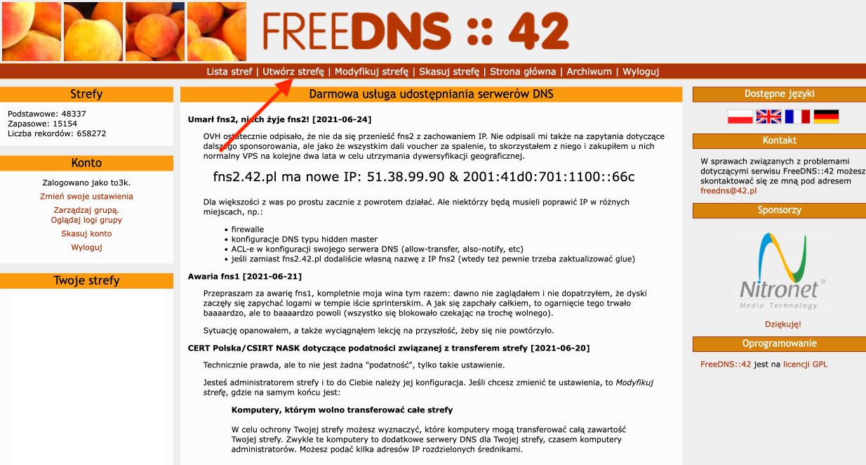 Zaczynamy od zalogowania się do swojego konta na FreeDNS::42. Przychodzimy do Utwórz strefę.