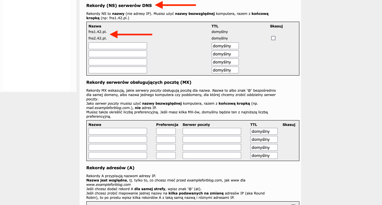 … aż znajdziemy sekcję Rekordy (NS) serwerów DNS. Widnieją w niej dwa adresy fns1.42.pl i fns2.42.pl. Na te adresy DNS mamy skierować cały ruch z posiadanej przez nas domeny. Robi się to na stronie dostawcy domeny.