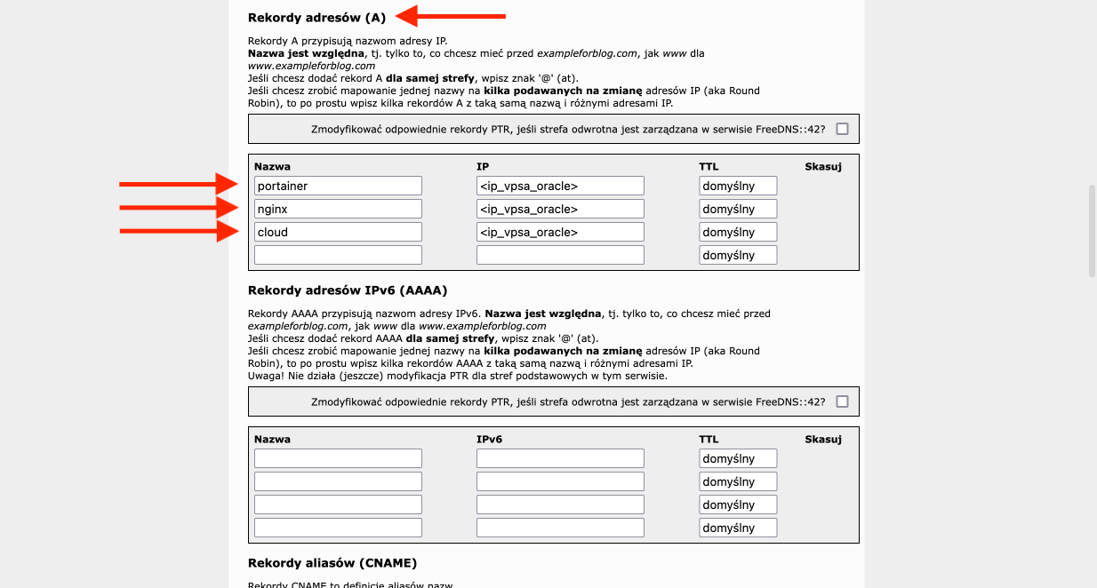 Na tej samej stronie przewijamy jeszcze trochę aż do sekcji Rekordy adresów (A), gdzie dodajemy trzy rekordy, które w kolumnie Nazwa będą miały wartości kolejno portainer, nginx i cloud, natomiast w kolumnie IP podajemy trzy razy adres naszego serwera VPS od Oracle.