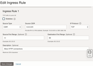 To jak otwierać porty w infrastrukturze Oracle opisałem w tym wpisie. W turbo skrócie robi się to wchodząc w Virtual Cloud Networks (pamiętam, aby najpierw wybrać odpowiedni Compartment) -> na liście znajdujemy naszą sieć i wchodzimy do jej właściwości -> z menu Resources po lewej wybieramy Security Lists -> na liście powinna być tylko jedna nazwana Default Security List for…. Interesują nas w tym miejscu Ingress Rules i korzystając z przycisku Add Ingress Rules dodajemy reguły otwierające porty 80, 443, 81, 444, 9443. Robimy to wypełniając formularz dla każdego z portów analogicznie do poniższego, w którym zademonstrowałem jak zrobić to dla portu 80.