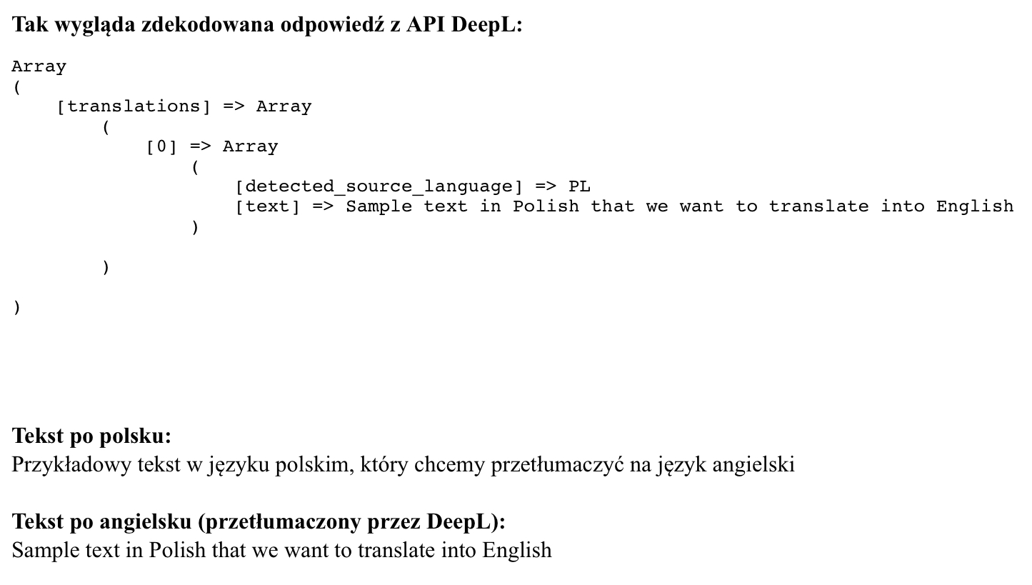 OK, we send the properly constructed cURL request to the DeepL API, and what鈥檚 next? We receive feedback in the form of a string in JSON (JavaScript Object Notation) format. We decode it using the json_decode() function. By the way, as the second argument when calling this function, we provide a value of true, which instructs the function to not only convert the JSON string into a PHP object, but also to convert that object into an array. In this way, we get the following result: