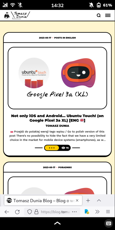 I have to admit that when writing my first impressions about Ubuntu Touch, which I included in my previous post, I was slightly disappointed with how the system turned out. In the case of Droidian, from the very beginning, I had a completely different experience. It may not be perfect and has many issues, but it gives me what I was looking for - it turned my pocket-sized smartphone into a full-fledged computer running a desktop distribution of Linux (Debian). Some people asked in the previous post why I spoke so negatively about Ubuntu Touch. The thing is, I wasn’t looking for a slightly more exotic system that would allow me to use my Pixel as a basic phone, i.e., making calls, sending texts, doing some browsing, and maybe using maps or playing audio. As I mentioned earlier, I was looking for something that would turn my phone into a highly portable computer, and Droidian is exactly that solution.
