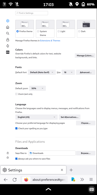 In my opinion, the main advantages of Droidian are the desktop version of Firefox and the unrestricted Linux Terminal. Most people probably wonder how to use a browser designed for a completely different screen size. It can be quite challenging at times because scaling is often a significant issue. However, it can be partially overcome by changing the interface Zoom to 50%. As for the Terminal, the experience is similar to a freshly installed minimal Debian. You need to perform basic tasks like changing the password (default is 1234), the first update, configuring APT repositories, and installing Flatpak and Snap. But afterwards, the system is ready to use.