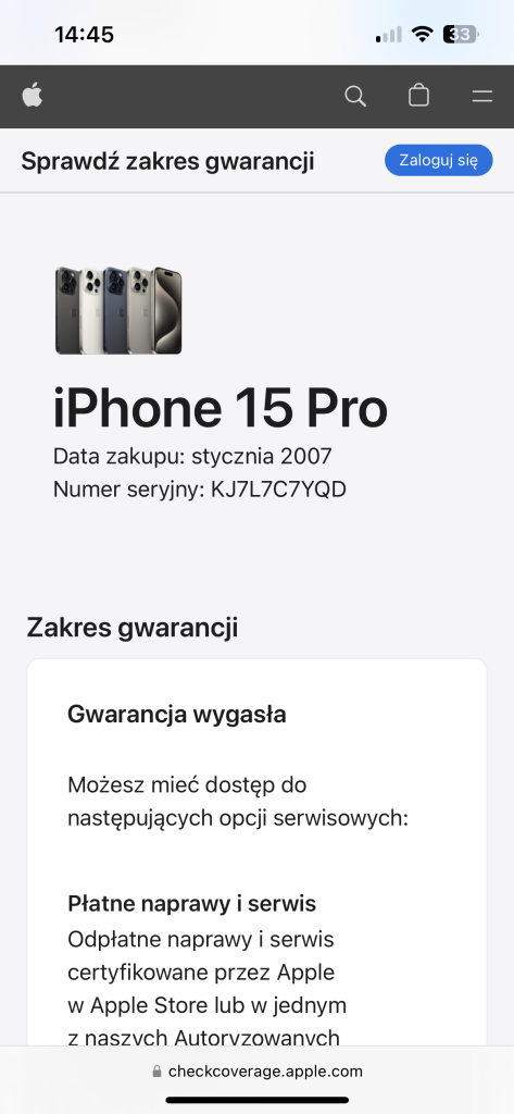 Wszedłem jeszcze na oficjalną stronę Apple do sprawdzania gwarancji po numerze seryjnym, gdzie okazało się, że sprawa jest jeszcze ciekawsza, bo według danych przez nią podanych telefon o takim numerze został wyprodukowany w styczniu 2007 (co oczywiście nie jest możliwe, bo w tym roku odbyła się premiera pierwszego iPhone, a nie tego z oznaczeniem 15) i oczywiście nie ma już gwarancji producenta.