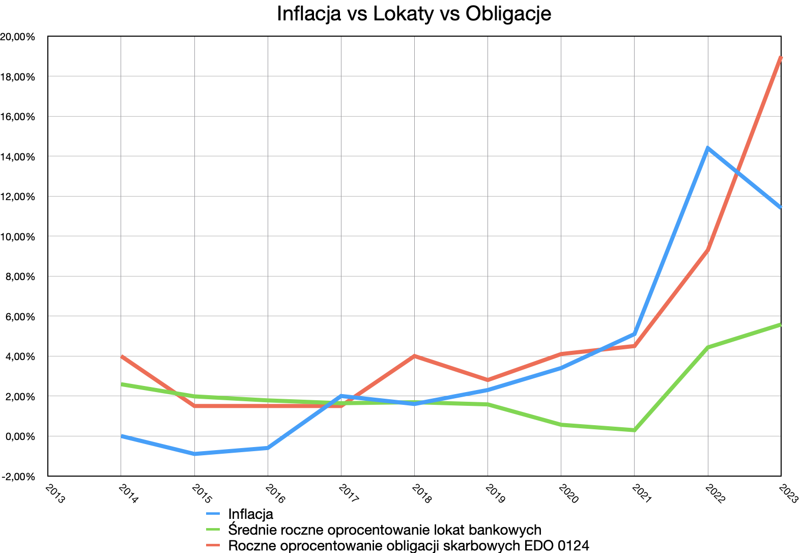 Oczywiście bez wykresów kalkulacja nie byłaby tak profesjonalna! Dlatego prezentuję pierwszy wykres, który przedstawia porównanie wysokość inflacji oraz oprocentowania lokat i obligacji EDO w latach 2014-2023.