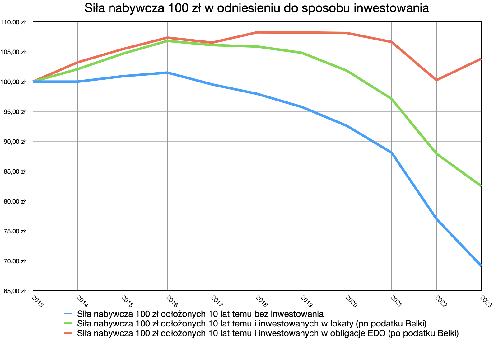 Niebieska linia nie jest dla nas zaskoczeniem, bo to co dzieje się z pieniędzmi bez inwestowania omówiliśmy sobie już w poprzednim rozdziale tego wpisu. Linia zielona to wynik inwestowania w lokaty i widać jak na dłoni, że inwestowanie w ten instrument finansowy to mizerny sposób na ochronę swoich pieniędzy przed inflacją, bo w przeważającej ilości okresów jej nie pokona, jednakże nawet i taki wynik jest lepszy od nie robienia niczego. Na pocieszenie, optymistyczny wynik prezentuje linia czerwona, która obrazuje wynik inwestowania w obligacje EDO. Widać, że w ten sposób nie tylko ochroniliśmy oszczędności przed inflacją, ale także wypracowaliśmy delikatnie dodatni wynik. Skumulowany zysk na poziomie 3.84% ponad inflację w okresie 10 lat to naprawdę niezły rezultat! Osobiście czegoś podobnego oczekiwałbym po częściach moich portfeli inwestycyjnych, w których trzymam obligacje. Oczywiście obligacji, nawet tych indeksowanych inflacją, nie należy traktować jako pewne źródło zysku, bo nawet oferując oprocentowanie w wysokości inflacja (wyliczona na bazie poprzedniego roku) + 1.5% może ona nie być w stanie pokonać inflacji po odliczeniu 19% podatku od zysków kapitałowych (Belki). Jednakże mimo to w mojej ocenie jest to najlepsza forma inwestowania dla osób, które nie lubią ryzyka i nie chcą poświęcać, więcej niż godziny rocznie na inwestowanie.