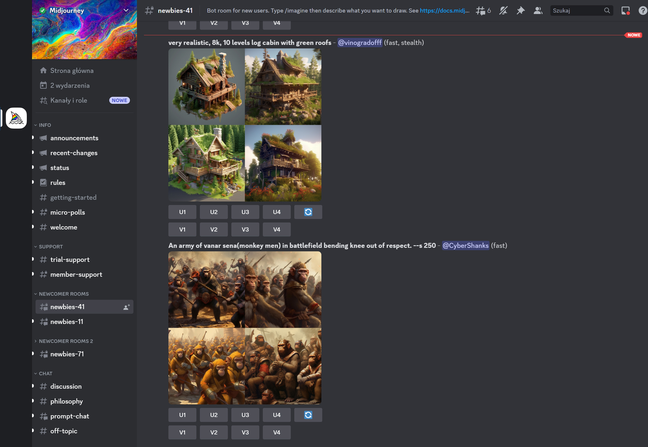 Jakby ktoś nie wiedział to Midjourney to narzędzie do generowania grafik na podstawie prompt’ów, czyli zwykłych tekstowych opisów definiujących to co chcemy zobaczyć na wygenerowanej komputerowo grafice. Midjourney jest narzędziem darmowym (przynajmniej w tym momencie, kiedy jest jeszcze w otwartej becie), choć istnieją płatne plany, ale różnica zamyka się w zasadzie w tym, że będąc użytkownikiem darmowym priorytet naszych zadań jest niski, co w praktyce oznacza to, że będziemy musieli dłużej poczekać na wygenerowanie grafiki dla nas. Sposób użycia jest też dość ciekawy, bo odbywa się to przez Discord’a.
