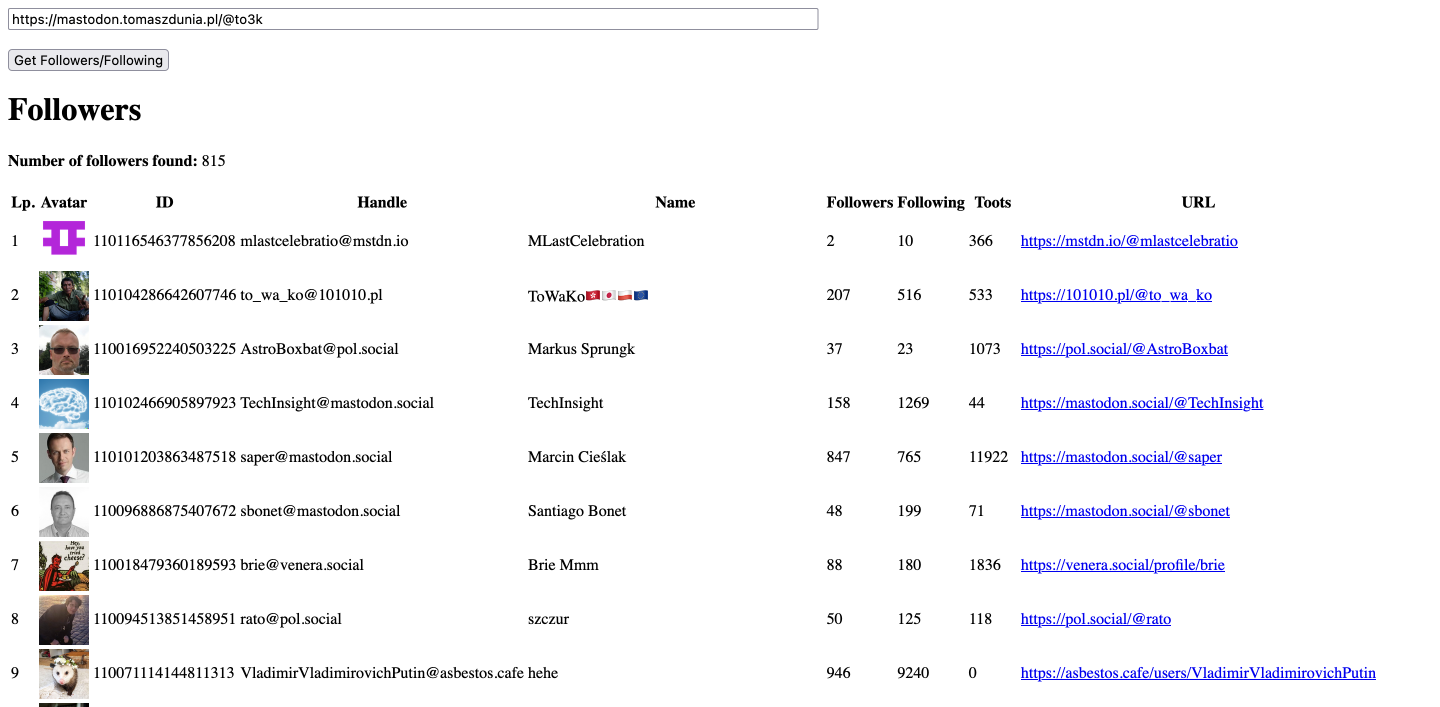 Aha, jeszcze lista obserwowanych. Sprawa wygląda bardzo analogicznie z tym, że w linku frazę followers należy zamienić na following - https://mastodon.tomaszdunia.pl/api/v1/accounts/110012691117775438/following?limit=80.