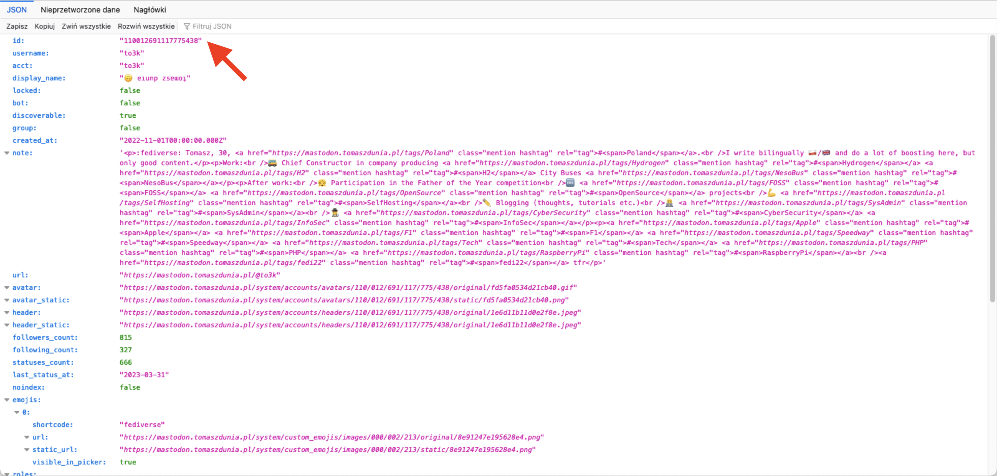 Szukane ID wskazałem czerwoną strzałką na powyższym zrzucie ekranu. Bierzemy to ID i tworzymy link będący zapytaniem o listę obserwowanych - https://mastodon.tomaszdunia.pl/api/v1/accounts/110012691117775438/followers. W ten sposób otrzymaliśmy obiekt JSON będący tablicą z informacjami o 40 kontach, które obserwują mnie na Mastodonie. Zmodyfikujmy ten link dodając do niego na końcu parametr limit, aby otrzymać dwa razy więcej wyników (wartość maksymalna jaką możemy uzyskać to 80) - https://mastodon.tomaszdunia.pl/api/v1/accounts/110012691117775438/followers?limit=80. Co w przypadku, gdy ktoś ma więcej niż 80 obserwujących i chce uzyskać całą listę? Do tego potrzebujemy wykorzystać paginację, ale o niej w dalszej części wpisu.