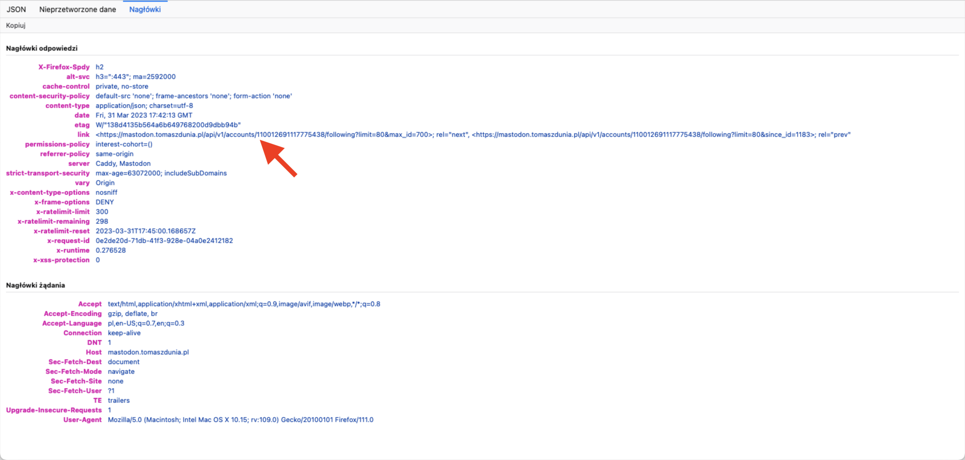 Załóżmy, że mam 800 obserwujących. Korzystając z linka - https://mastodon.tomaszdunia.pl/api/v1/accounts/110012691117775438/followers?limit=80, który skonstruowaliśmy wcześniej, otrzymujemy w odpowiedzi od serwera listę 80 kont, które obserwują mnie na Mastodonie. Są to konta posortowane czasowo, zaczynając od najświeższego obserwatora (osoby, która zaczęła mnie obserwować jako ostatnia). Tak, więc 1/10 listy moich obserwowanych już mamy. Jak w takim razie przejść do następnej strony i poznać obserwatorów od 81 do 160? Musimy ustalić jaki będzie URL następnej strony, a informację o tym dostajemy w nagłówku (header) odpowiedzi od API. Jest to konkretnie zawarte w parametrze nazywającym się link. W Firefox wystarczy zmienić zakładkę z JSON na Nagłówki i otrzymamy coś podobnego do tego: