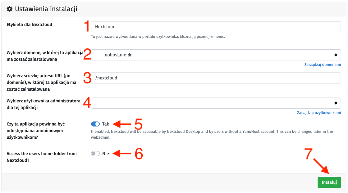 Drugie pole wyboru [6] to pytanie czy chcemy nadać Nextcloud możliwość dostępu do folderu /home na naszym serwerze. Osobiście nie widzę takiej potrzeby, a jest to na pewno ryzykowana sprawa, bo w przypadku zaznaczenia Tak, NC uzyska dostęp np. do pozostałych aplikacji działających na YunoHost. Każdy zdecyduje za siebie, bo wszystko zależy konkretnego zastosowania. Ja jednak pozostawiam wybraną opcję Nie.