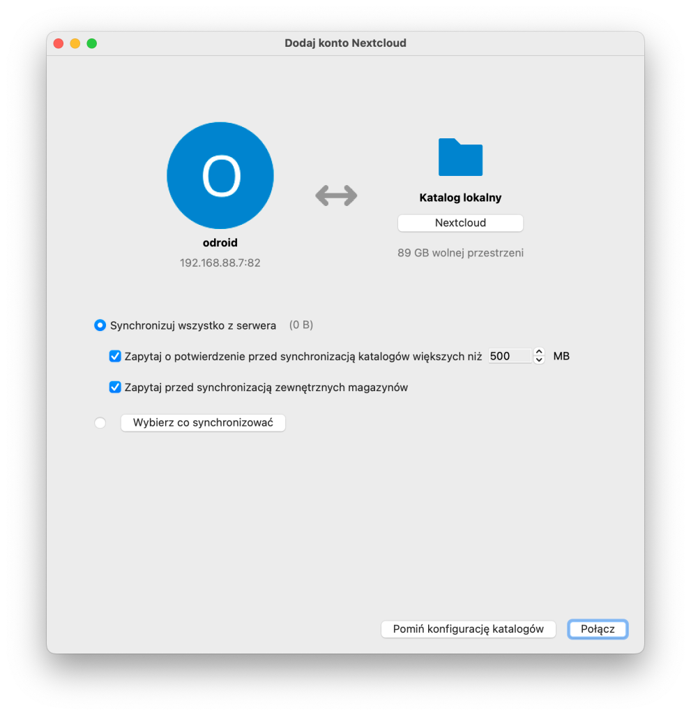 Na koniec wracamy do świeżo zainstalowanej aplikacji Nextcloud, gdzie pozostaje nam jeszcze podstawowa konfiguracja klienta. Podajemy folder w pamięci lokalnej komputera, do którego ma zostać podpięty Nextcloud. Reszta do zmiany według uznania. Na koniec potwierdzamy przyciskiem Połącz i gotowe. Tak skonfigurowany klient będzie nam w czasie rzeczywistym aktualizował pliki, co oznacza, że gdy zmodyfikujemy, dodamy lub usuniemy plik na dowolnym urządzeniu to za moment te zmiany będą miały odzwierciedlenie na serwerze, a następnie na innych podpiętych urządzeniach.