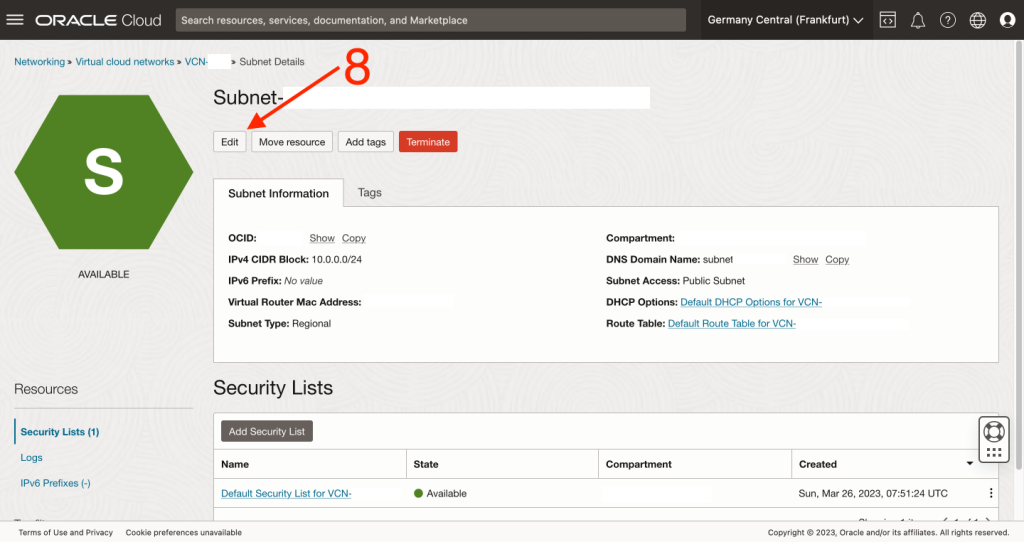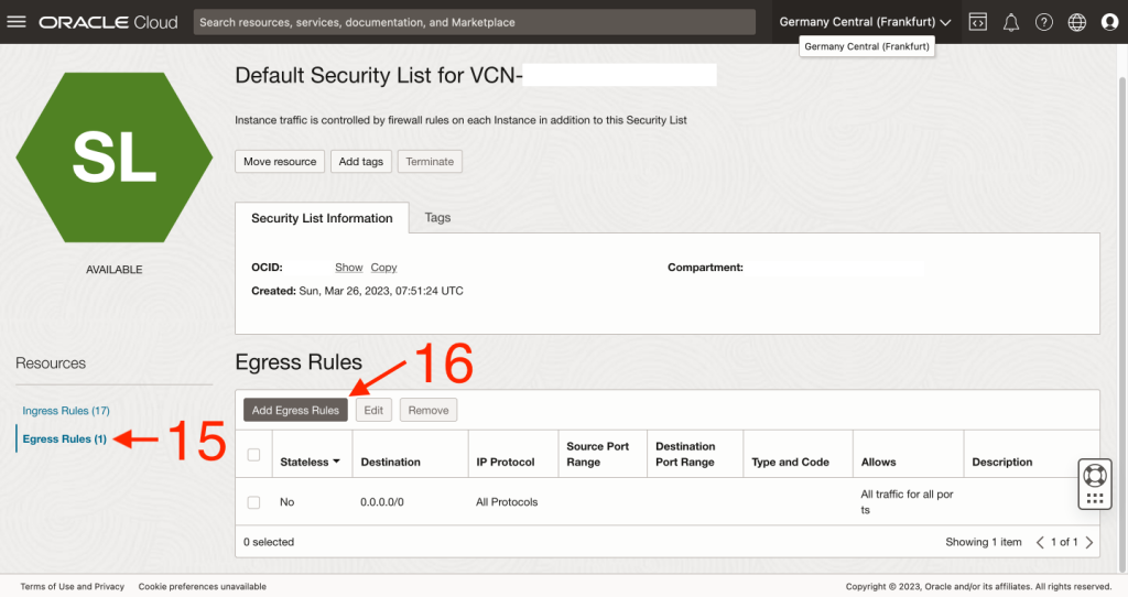 Teraz musimy jeszcze odpowiednio ustawić firewall. W tym celu wracamy do ustawień wirtualnej sieci chmurowej i w sekcji po lewej znajdujemy na liście Security Lists [12]. Na wyświetlonej liście znajdujemy pozycję, która nas interesuje i wchodzimy w jej właściwości [13].