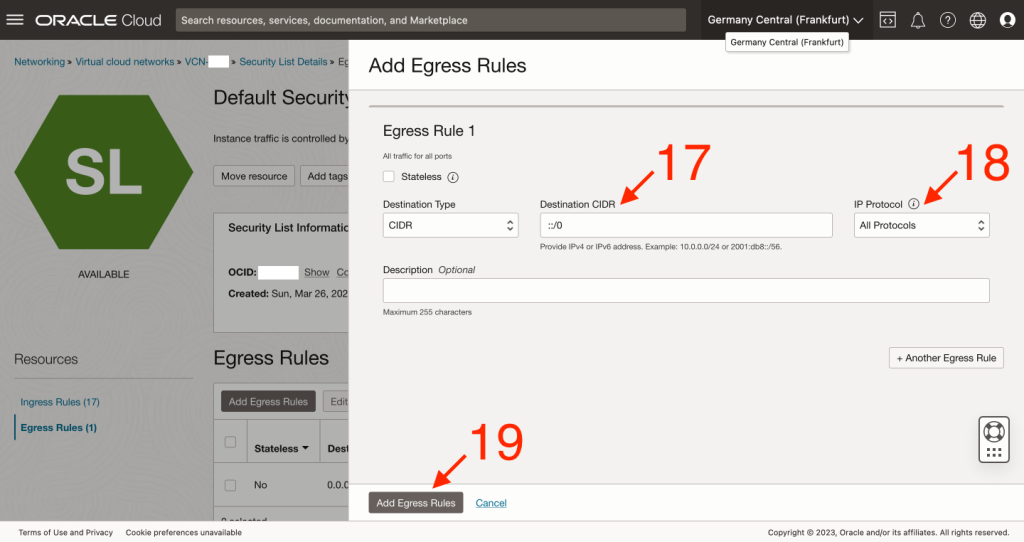 Jako Destination CIDR [17] podajemy ::/0, z listy rozwijanej IP Protocol wybieramy All Protocols [18] i potwierdzamy przyciskiem Add Egress Rules [19].