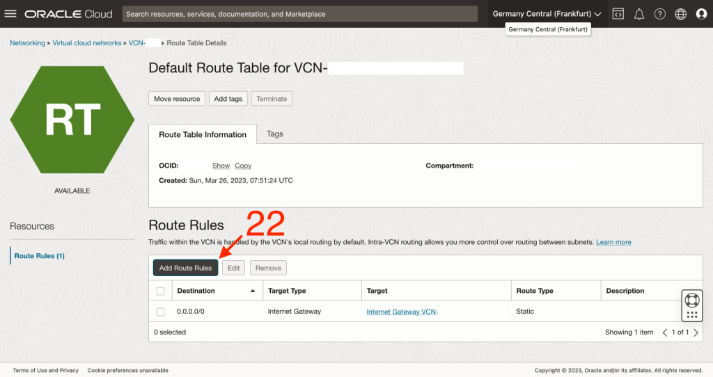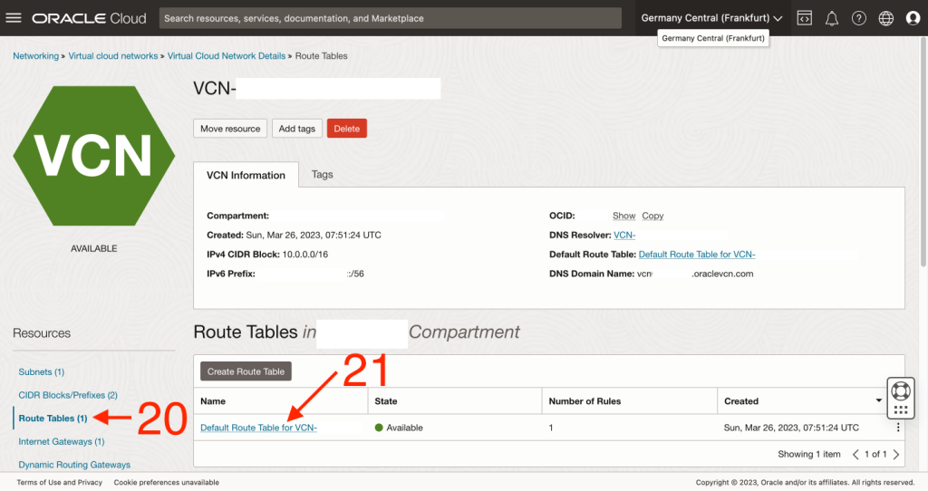 Po ustawieniu zapory musimy jeszcze ustawić routing. Wracamy do ustawień wirtualnej sieci chmurowej i w sekcji po lewej znajdujemy na liście Route Tables [20]. Wyświetlonej liście znajdujemy pozycję, która zaczyna się od Default Route Table for… [21] i wchodzimy do jej właściwości.