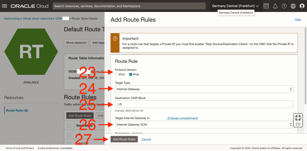 W oknie, które wysunie się z prawej strony, w Protocol Version [23] wymieramy IPv6, z listy rozwijanej Target Type [24] wybieramy Internet Gateway, w pole tekstowe Destination CIDR Block [25] wpisujemy ::/0, z listy rozwijanej Target Internet Gateway [26] wybieramy naszą wirtualną sieć chmurową i to wszystko zatwierdzamy przyciskiem Add Route Rules [27].