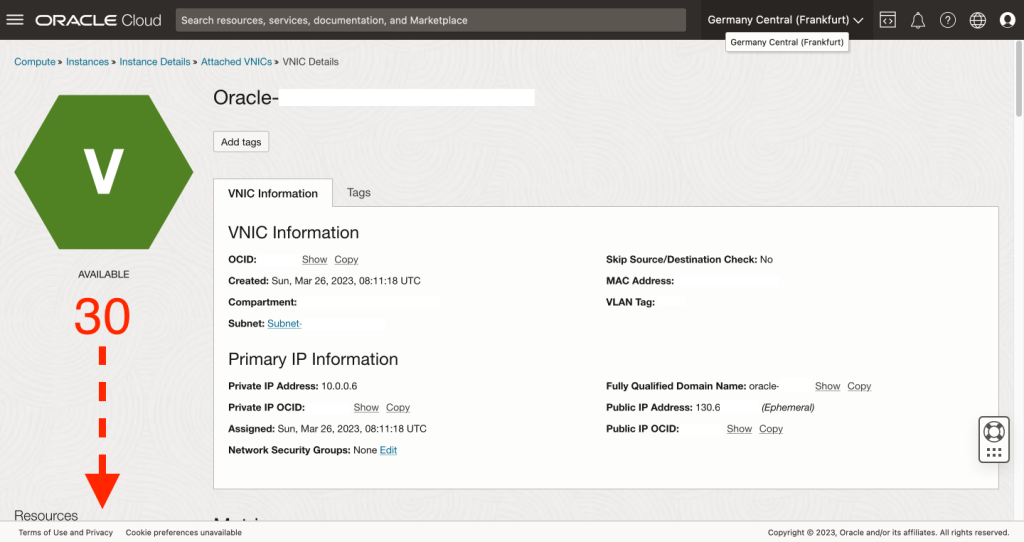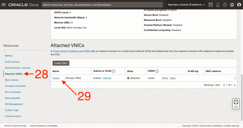 W sekcji po lewej znajdujemy Attached VNICs [28], a z listy, która zostanie wyświetlona, wybieramy tą jedyną kartę VNIC (Virtual Network Interface Card, z ang. wirtualna karta sieciowa) [29], która zostanie wyświetlona, i wchodzimy w jej właściwości.