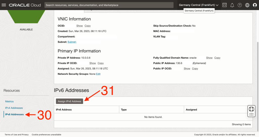 Już po opublikowaniu tego wpisu przypomniałem sobie, że powinienem omówić jeszcze jeden temat jakim jest włączenie obsługi IPv6. Bez tego maszyna będzie prawidłowo działała jednak do prawidłowego działania niektórych usług, które możemy na niej uruchomić, obsługa IPv6 jest zalecana. Przykładem takiej usługi jest instancja Mastodona, która zadziała jedynie na IPv4, ale bez IPv6 nie będzie mogła się komunikować z innymi instancjami, które działają właśnie w oparciu o tę adresację. Oracle daje nam możliwość włączenia IPv6 i przypisania naszej instancji adresu, więc to właśnie zrobimy.