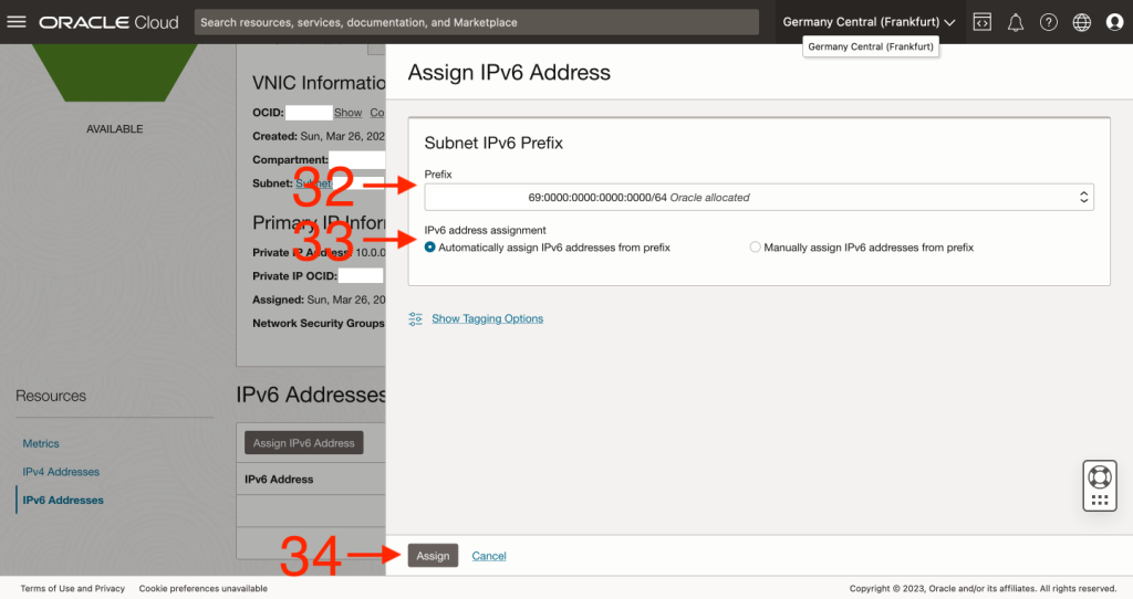 W oknie, które wysunie się z prawej strony, z listy rozwijanej Prefix [32] wybieramy prefiks, który wcześniej utworzyliśmy (na liście powinna być do wyboru tylko jedna pozycja). Poniżej proponuję pozostawić domyślny wybór, a więc dla IPv6 address assignment [33] wybraną opcję Automatically assign IPv6 addresses from prefix, która oznacza, że adres dla naszej instancji zostanie wybrany automatycznie. Jeżeli chcemy to oczywiście zawsze możemy zmienić to ustawienie na manualne i zdefiniować konkretny adres samemu. Potwierdzamy przyciskiem Assign [34].