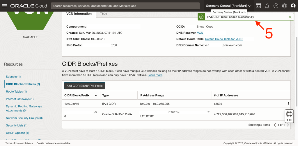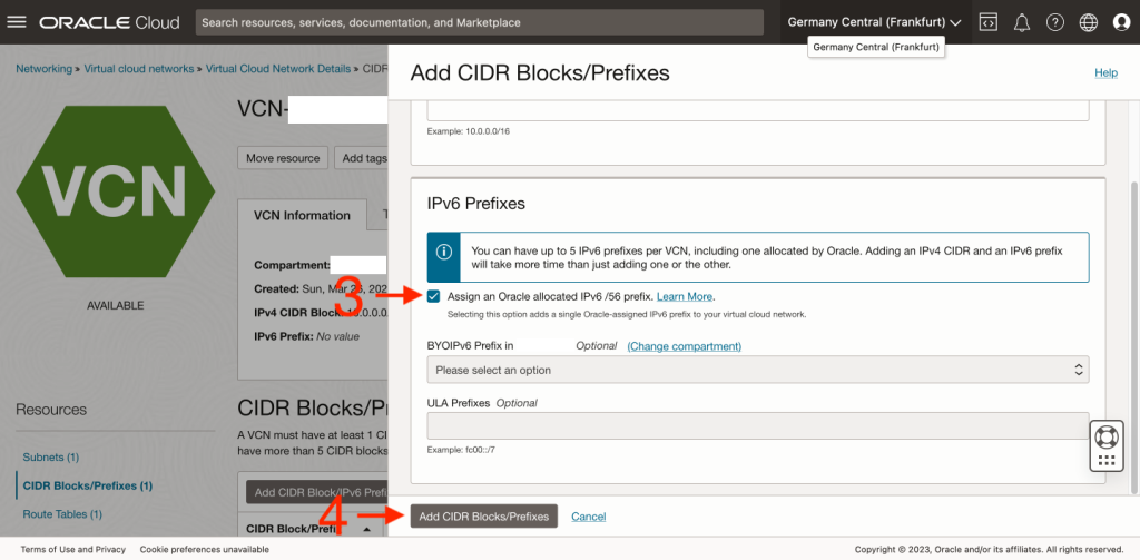 W oknie, które wysunie się z prawej strony, zjeżdżamy na dół, gdzie zaznaczamy opcję Assign an Oracle allocated IPv6 /56 prefix [3] i zatwierdzamy przyciskiem Add CIDR Blocks/Prefixes [4].