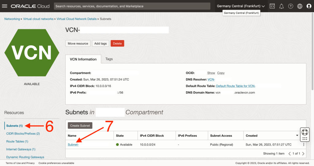 Teraz utworzony adres IPv6 musimy przypisać do podsieci, w której znajduje się nasza instancja. W sekcji po lewej przechodzimy do Subnets [6]. Na liście znajdujemy odpowiednią podsieć [7] i wchodzimy w jej właściwości.