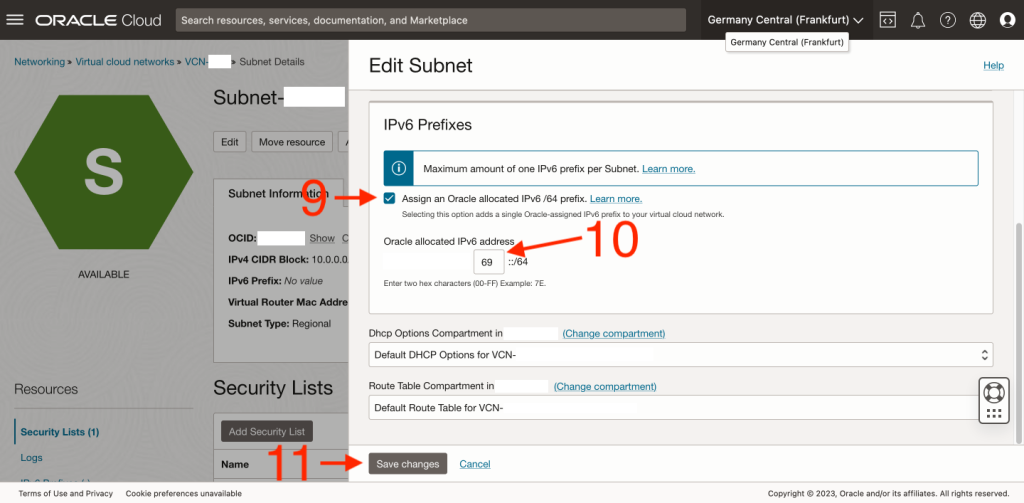 W oknie, które wysunie się z prawej strony, w sekcji IPv6 Prefixes zaznaczamy Assign an Oracle allocated IPv6 /64 prefix [9], a gdy to zrobimy pokaże nam się jeszcze dodatkowe pole tekstowe [10], w które musimy wpisać dowolną dwu-znakową wartość heksadecymalną pomiędzy 00 a FF. Nie ma znaczenia co tutaj podamy, więc załóżmy, że będzie to 69 (😎). Pozostaje nam jeszcze potwierdzić przyciskiem Save changes [11].