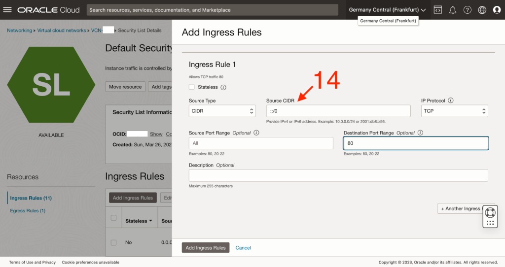 Analogicznie robimy to samo dla portu 443. W polu Source CIDR [9] wpisujemy wartość 0.0.0.0/0, następnie w polu Destination Port Range [10] wpisujemy wartość 443 i potwierdzamy przyciskiem Add Ingress Rules [11].