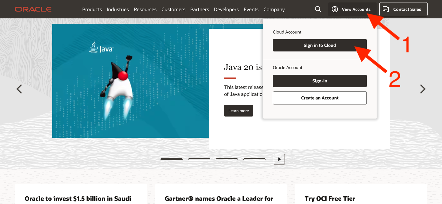 Wchodzimy na oracle.com, znajdujemy w prawym górnym rogu przycisk View Accounts [1], po którego naciśnięciu wysunie nam się okienko, gdzie naciskamy przycisk Sign in to Cloud [2].