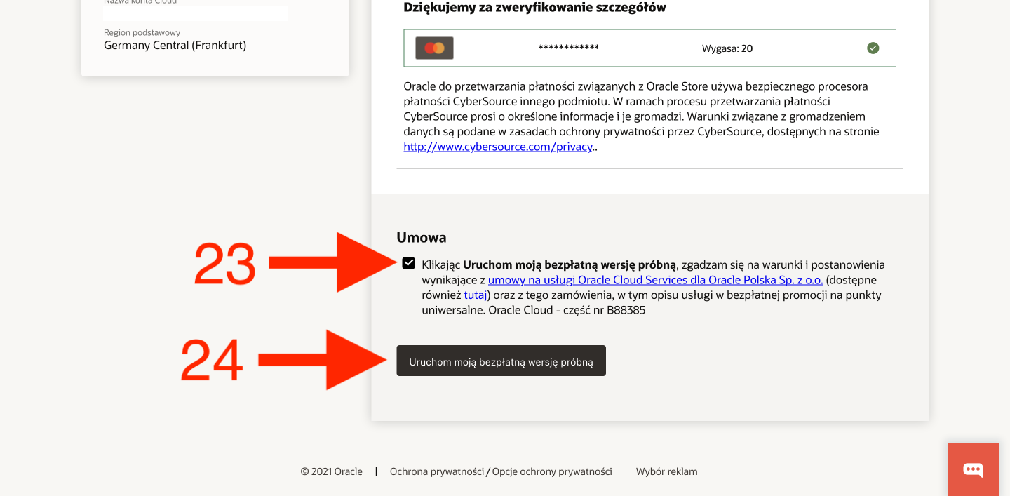 Po zamknięciu w/w okienka wracamy ponownie do formularza rejestracyjnego, w którym powinna zostać dodana nasza karta. Przewijamy stronę na dół, zaznaczamy wymaganą zgodę na uruchomienie bezpłatnej wersji próbnej [23] i finalizujemy wszystko przyciskiem Uruchom moją bezpłatną wersję próbną [24].