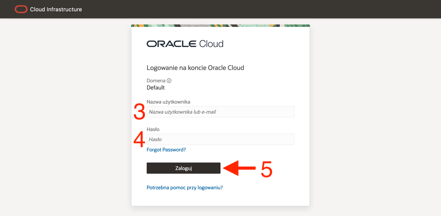 Zostaniemy przekierowani do panelu logowania, pod którym w sekcji Not an Oracle Cloud customer yet? naciskamy przycisk Sign Up [3].