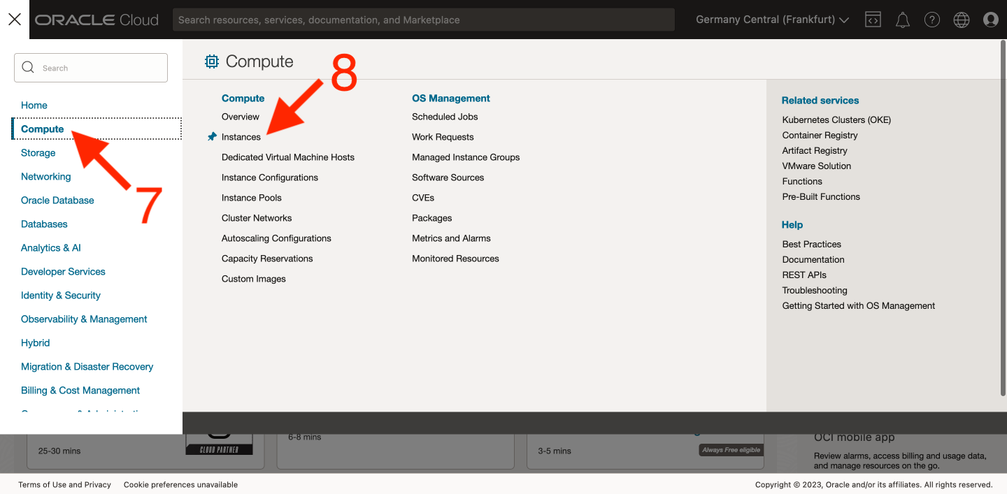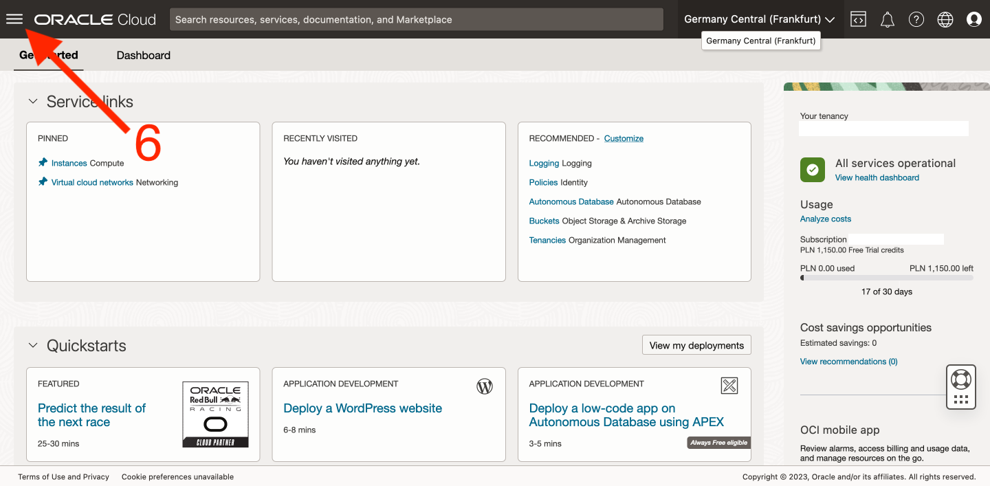 Jesteśmy w naszym centrum dowodzenia. Aktywujemy menu głównego poprzez naciśnięcie przycisku z trzema poziomymi kreskami w lewym górnym rogu [6]. Następnie zakładka Compute [7], a w niej Instances [8].