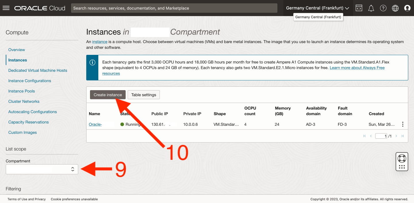 Zostaniemy przeniesieni do centrum zarządzania naszymi instancjami (maszynami wirtualnymi). W pierwszej kolejności, jeżeli nie jest to, musimy wybrać Compartment [9], będziemy mieli tylko jeden wybór, którym będzie [nasz account name] (root). Na zrobionym przeze mnie zrzucie ekranu widać, że już jest jedna instancja, w Twoim przypadku jej nie będzie, bo dopiero zamierzamy ją utworzyć. Naciskamy przycisk Create instance [10].