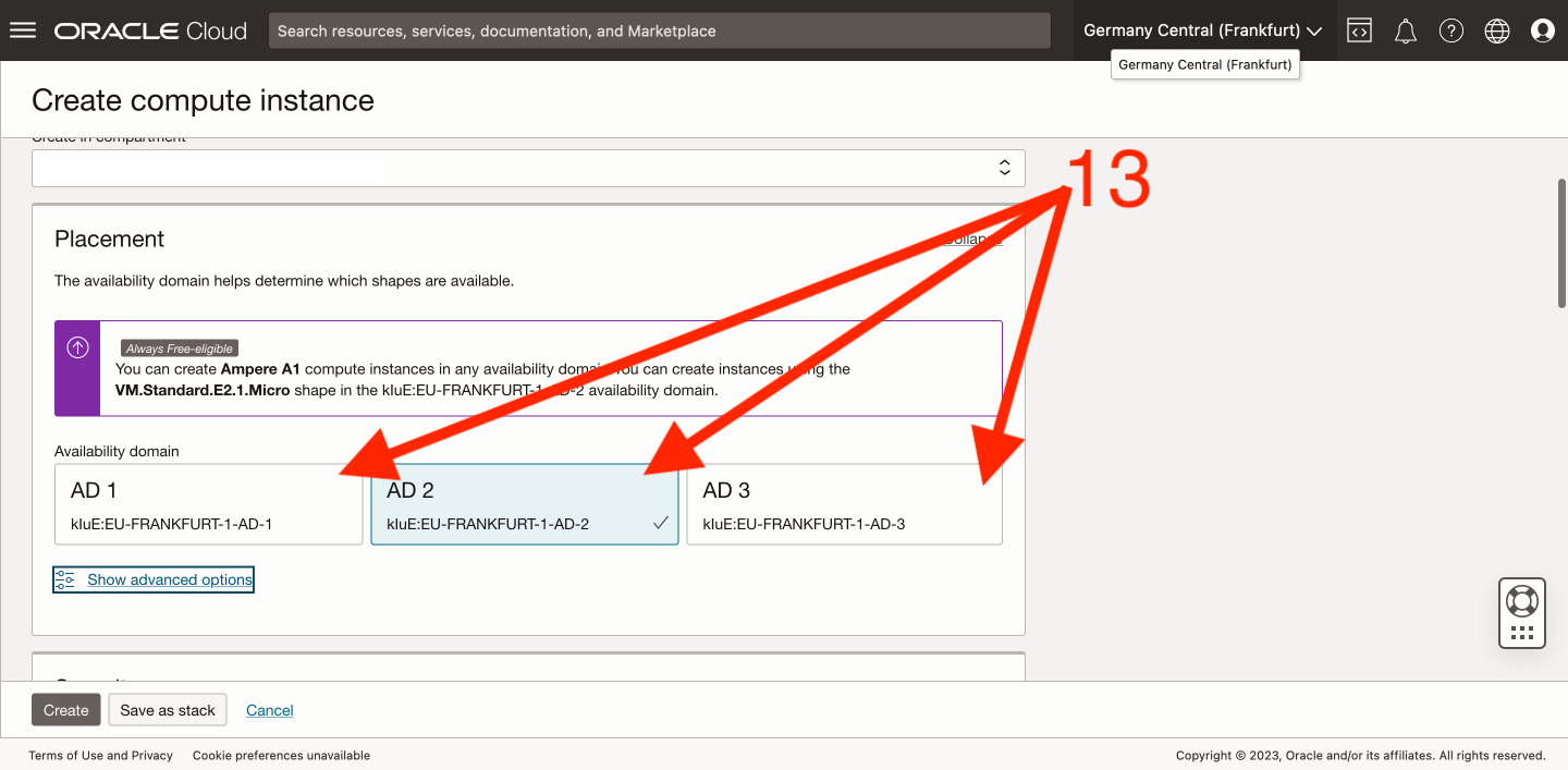 W sekcji Placement decydujemy, w której Domenie utworzymy naszą maszynę [13]. Jeżeli wcześniej jako region wybraliśmy Frankfurt to będziemy tutaj mieli trzy domeny do wyboru. Wydaje mi się, że nie ma większego znaczenia, którą wybierzemy. Istnieje natomiast szansa, że będziemy musieli później wrócić do tego miejsca i zmienić domenę, bo podczas finalizacji tworzenia instancji może nam wyskoczyć błąd, że w tej, którą akurat wybraliśmy nie ma już wolnych maszyn o wybranych przez nas parametrach. Wtedy z np. AD-2 zmieniamy na AD-3 i próbujemy jeszcze raz.