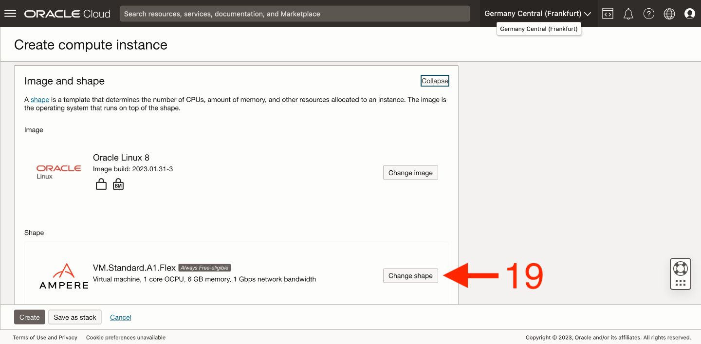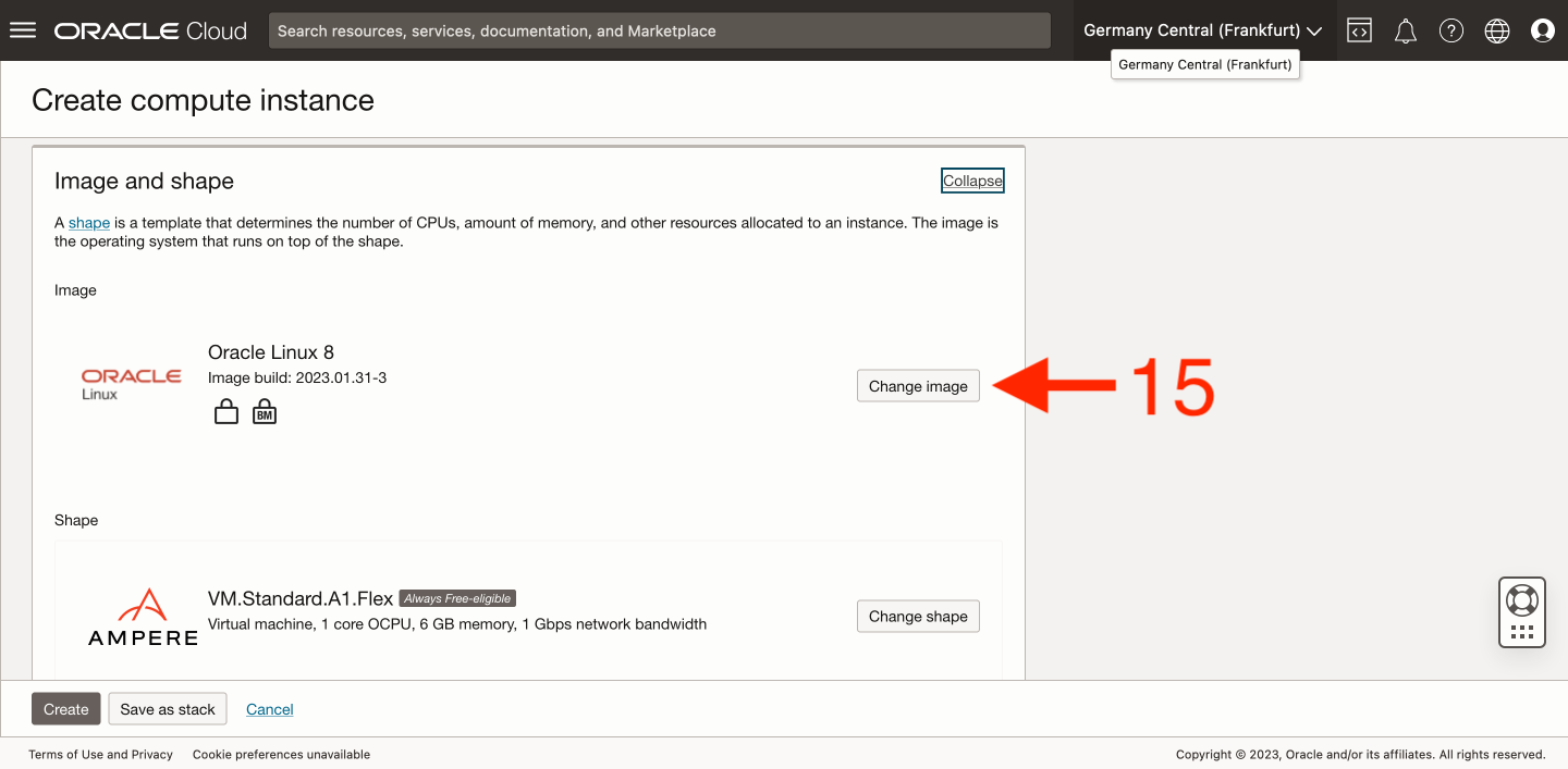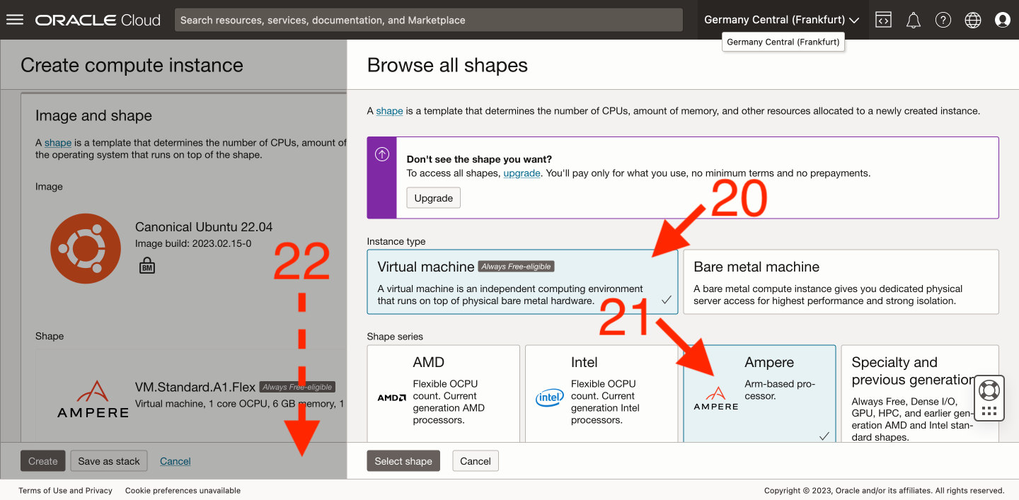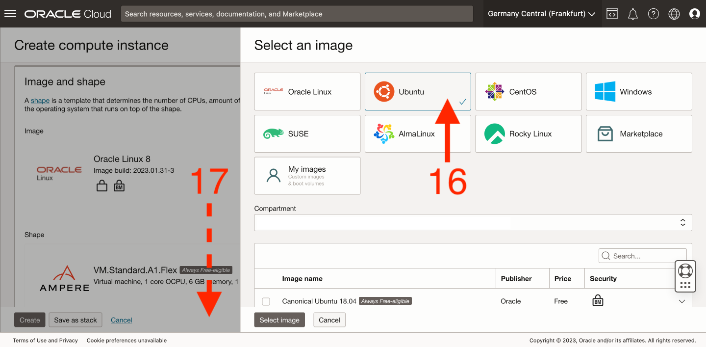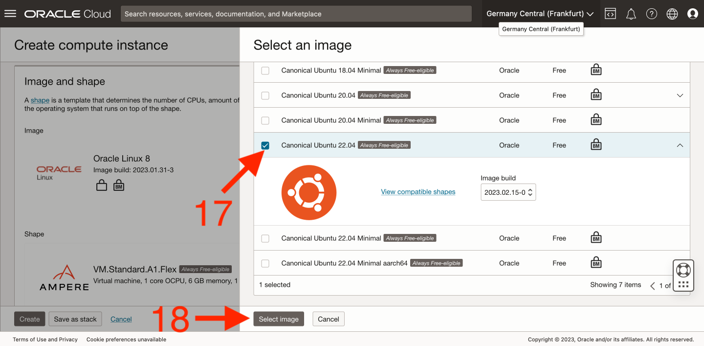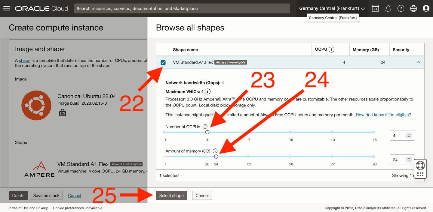 Przechodzimy dalej do sekcji Image and shape i rozwijamy ją tak samo jak poprzednią [14]. Po rozwinięciu ukazuje nam się możliwość wyboru systemu operacyjnego i parametrów instancji. Zaczynamy od systemu, czyli skorzystajmy z przycisku Change image [15]. W oknie, które wyskoczy proponuję wybrać Ubuntu [16], zjechać na niżej, wybrać wersję 22.04 [17] i zatwierdzić przyciskiem Select image [18]. Teraz naciskamy przycisk Change shape [19], który otwiera nam konfigurator parametrów maszyny. Wybieramy Virtual machine [20], Ampere [21], zaznaczamy VM.Standard.A1.Flex [22], zmieniamy Number of OCPUs na 4 [23], sprawdzamy czy Amount of memory (GB) jest ustawione na 24GB [24] i zatwierdzamy przyciskiem Select shape [25].