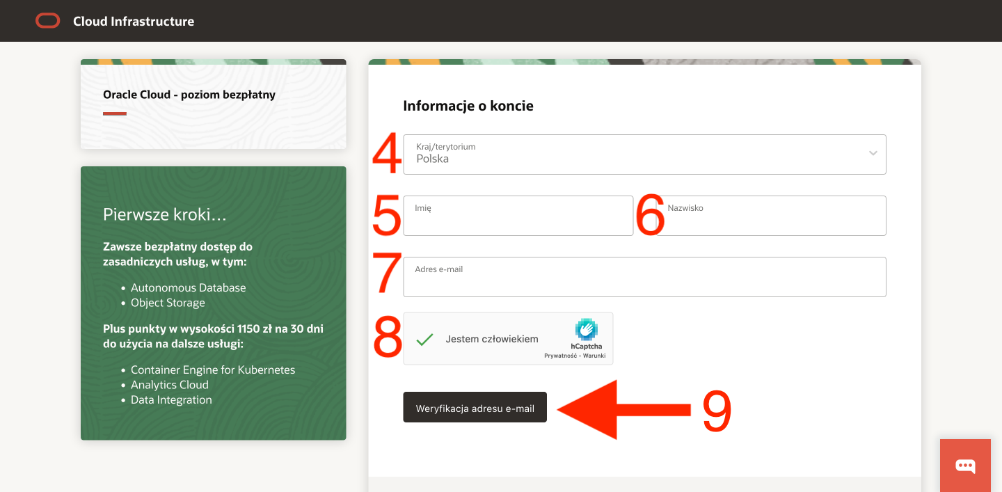 Strona przenosi nas do formularza rejestracyjnego, w którym podajemy podstawowe informacje jak kraj [4], imię [5], nazwisko [6] i adres e-mail [7], na który po zatwierdzeniu dostaniemy maila potwierdzającego, więc musi on być prawdziwy. Uczulam, bo niektórzy lubią w takich przypadkach skorzystać z rozwiązania pokroju tymczasowego maila (np. 10-minutowego) czy coś w tym stylu. Na koniec jeszcze potwierdzenie, że nie jesteśmy robotem [8] i zatwierdzamy przyciskiem Weryfikacja adresu e-mail [9].