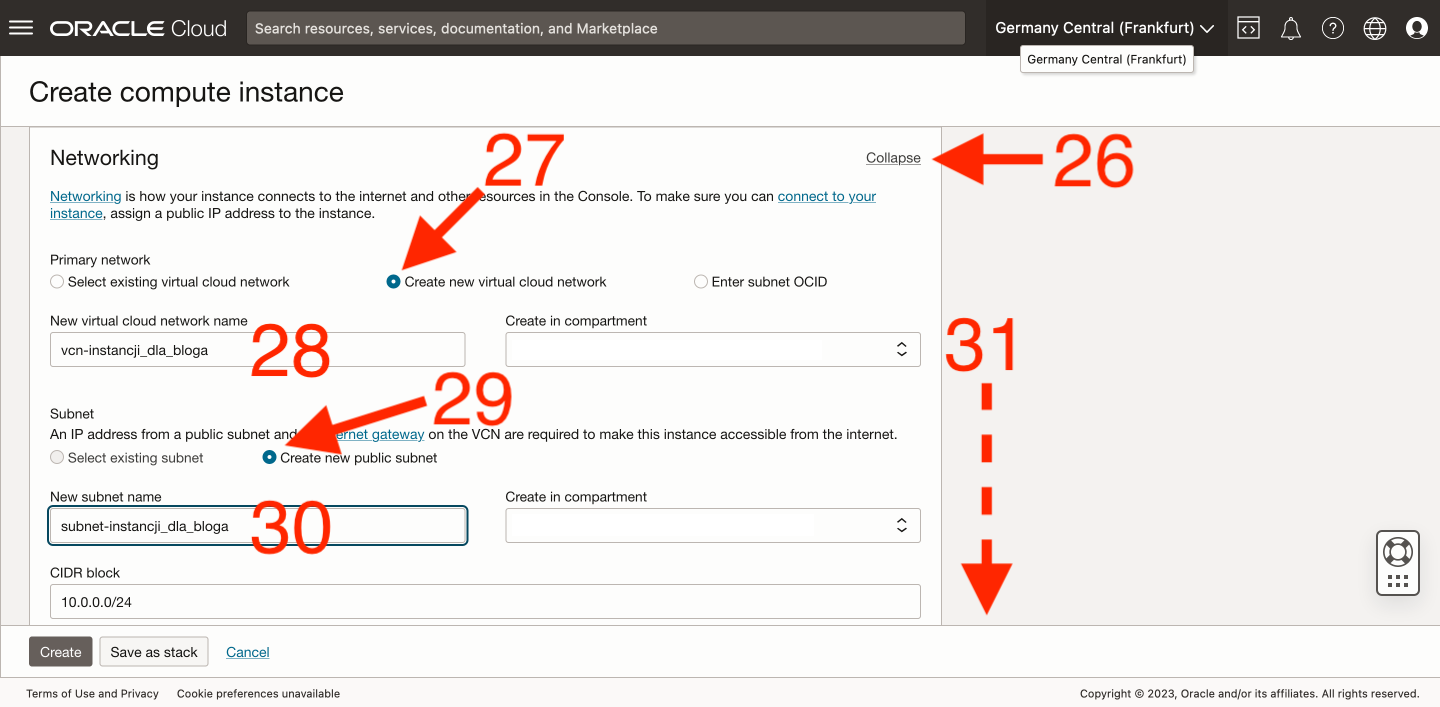 Następna interesująca nas sekcja to Networking, którą oczywiście rozwijamy [26]. W tej sekcji mamy do ustawienia trzy rzeczy. Pierwsza to Primary network, którą obrazowo można przedstawić jako domową sieć Wi-Fi, w której znajdują się wszystkie nasze urządzenia. Jesteśmy dopiero na początku drogi, więc po prostu utwórzmy nową, wirtualną sieć chmurową wybierając Create new virtual cloud network [27] i nadając jej jakąś nazwę [28]. Druga rzecz to Subnet, czyli podsieć naszej sieci głównej. To odpowiednik ustawiania na domowym routerze podsieci o adresacji np. od 192.168.0.1 do 192.168.0.255. Tutaj tak samo tworzymy nową podsieć wybierając opcję Create new public subnet [29] i nadając jej jakąś nazwę [30]. Ostatnią rzeczą jaka pozostała nam w ustawieniach sieciowych to sprawdzenie, że na pewno mamy zaznaczone Assign a public IPv4 address [31], co oznacza żądanie przypisania dla naszej instancji dedykowanego, publicznego adresu IPv4. Jeszcze raz chciałbym podkreślić, że jest to super opcja, która jest niedostępna dla wielu płatnych VPSów.