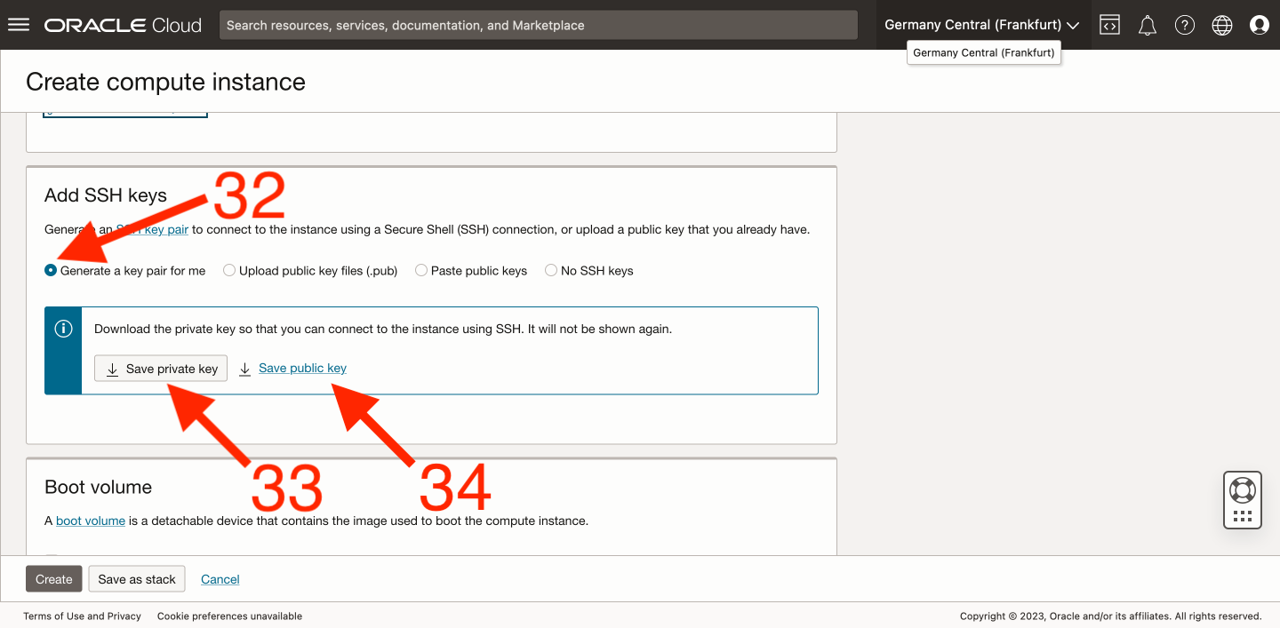 Kolejna sekcja to Add SSH keys, która, jak można się domyślić, dotyczy kluczy, którymi będziemy się uwierzytelniać podczas komunikacji po SSH. Oracle (słusznie) nie daje możliwości logowania się do serwera przy użyciu jedynie loginu i hasła, wymusza natomiast konieczność korzystania z kluczy SSH. Podczas tworzenia nowej instancji proponuję po prostu wybrać opcję Generate a key pair for me, czyli pozwolić Oracle wygenerować dla nas parę kluczy i pobrać te klucze - prywatny [33] i publiczny [34]. Istotne jest, aby nie stracić tych kluczy, bo bez nich nie dostaniemy się do naszego serwera.