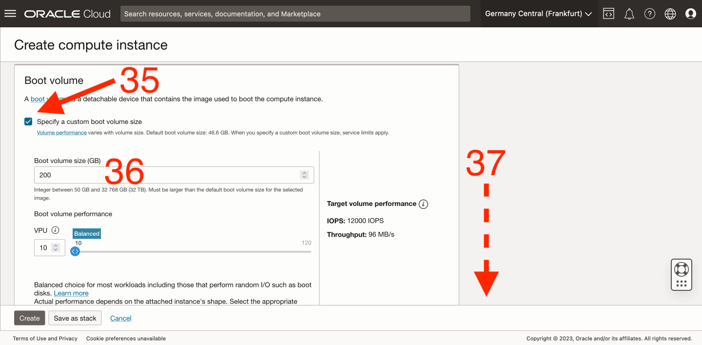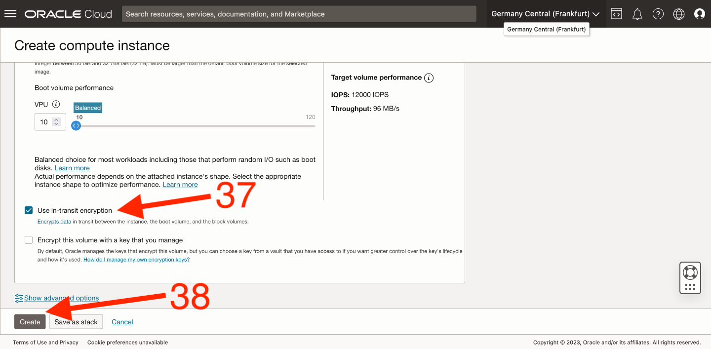 Ostatnia sekcja to Boot volume, w której możemy zwiększyć przestrzeń dyskową jaka zostanie przydzielona do tej instancji. Realizuje się to poprzez zaznaczenie opcji Specify a custom boot volume size [35] i wpisanie w pole Boot volume size (GB) wartości od 50 do 200 [36]. Domyślnie jest to 50GB, ale w zakresie Free Tier można korzystać z 200GB i tę wartość polecam tam wpisać. Proponuję jeszcze w dolnej części tej sekcji zaznaczyć opcję Use in-transit encryption [37], bo szyfrowanie podczas transferu danych jest zawsze dobrą opcją.
