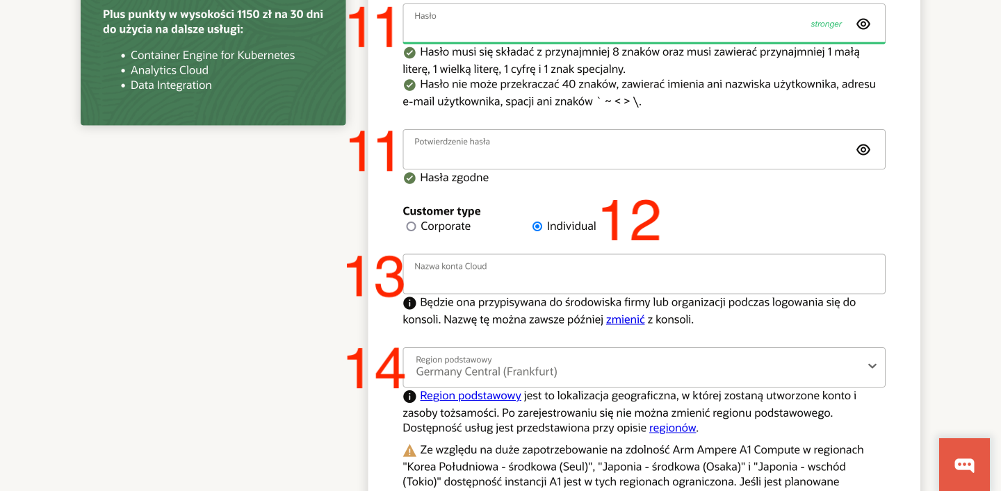 Po potwierdzeniu maila i powrocie do formularza rozszerza się jego zakres. Podajemy dwa razy hasło do konta [11]. W sekcji Customer type zaznaczamy Individual [12] (ciekawe, że to, jako zdaje się jedyne, nie zostało przetłumaczone na polski). W polu Nazwa konta Cloud wpisujemy nasz identyfikator [13], którego będziemy używać do logowania, i ważne jest tutaj, że nie jest to login, gdyż podczas logowania loginem jest adres e-mail, a ta nazwa to zupełnie co innego, jednak jest tak samo istotna podczas logowania, dlatego trzeba ją zapamiętać. Na koniec jeszcze pozostaje nam ustawić nasz region podstawowy [14]. Wybór regionu jest o tyle ważny, że przy darmowym koncie można rejestrować maszyny jedynie w tym regionie, który deklarujemy podczas rejestracji. Dopiero w planie płatnym jest możliwość posiadania dostępu do wszystkich regionów. Ja polecam tutaj wybrać region, który jest najbliżej naszego miejsca pobytu, a więc dla Polski będzie to niemiecki Frankfurt. Każdy kto kiedykolwiek kupował jakiegoś VPSa wie, że w Europie najbardziej popularne są dwa regiony Helsinki (Finlandia) i właśnie Frankfurt (Niemcy).