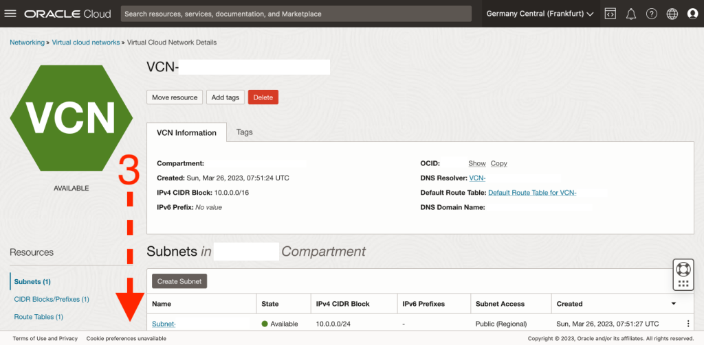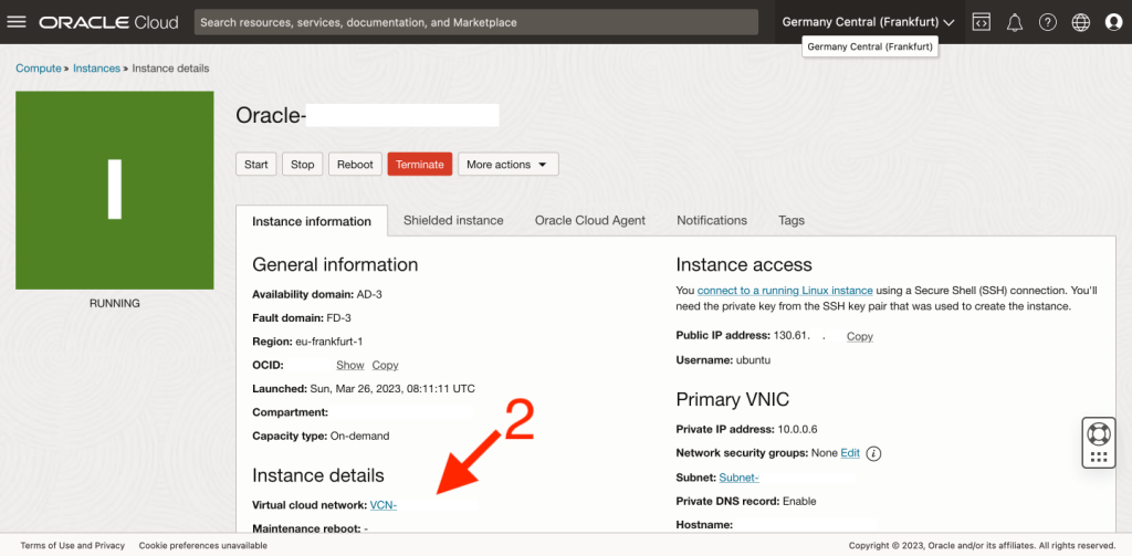W sekcji Instance details znajduje się łącze do Virtual cloud network [2], czyli odnośnik do wirtualnej sieci chmurowej, w której znajduje się nasza instancja. To właśnie w jej ustawieniach znajdziemy to czego szukamy, czyli reguły zapory sieciowej.