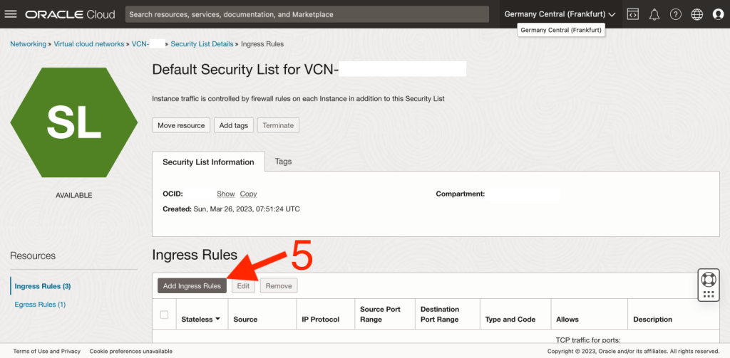 Ustawienia zapory dzielą się na reguły dotyczące ruchu przychodzącego Ingress Rules i wychodzącego Egress Rules. Dodajemy nową regułę korzystając z przycisku Add Ingress Rules [5].