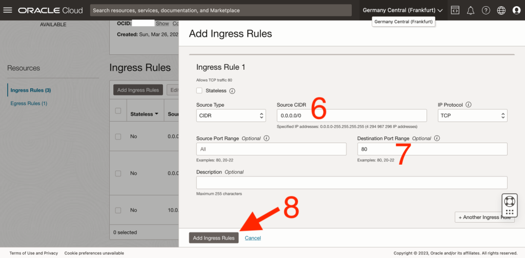 W polu Source CIDR [6] wpisujemy wartość 0.0.0.0/0, co oznacza, że nie ma znaczenia z jakiego adresu się łączymy. Następnie w polu Destination Port Range [7] wpisujemy wartość 80 i potwierdzamy przyciskiem Add Ingress Rules [8]. Ta reguła otwiera port 80.