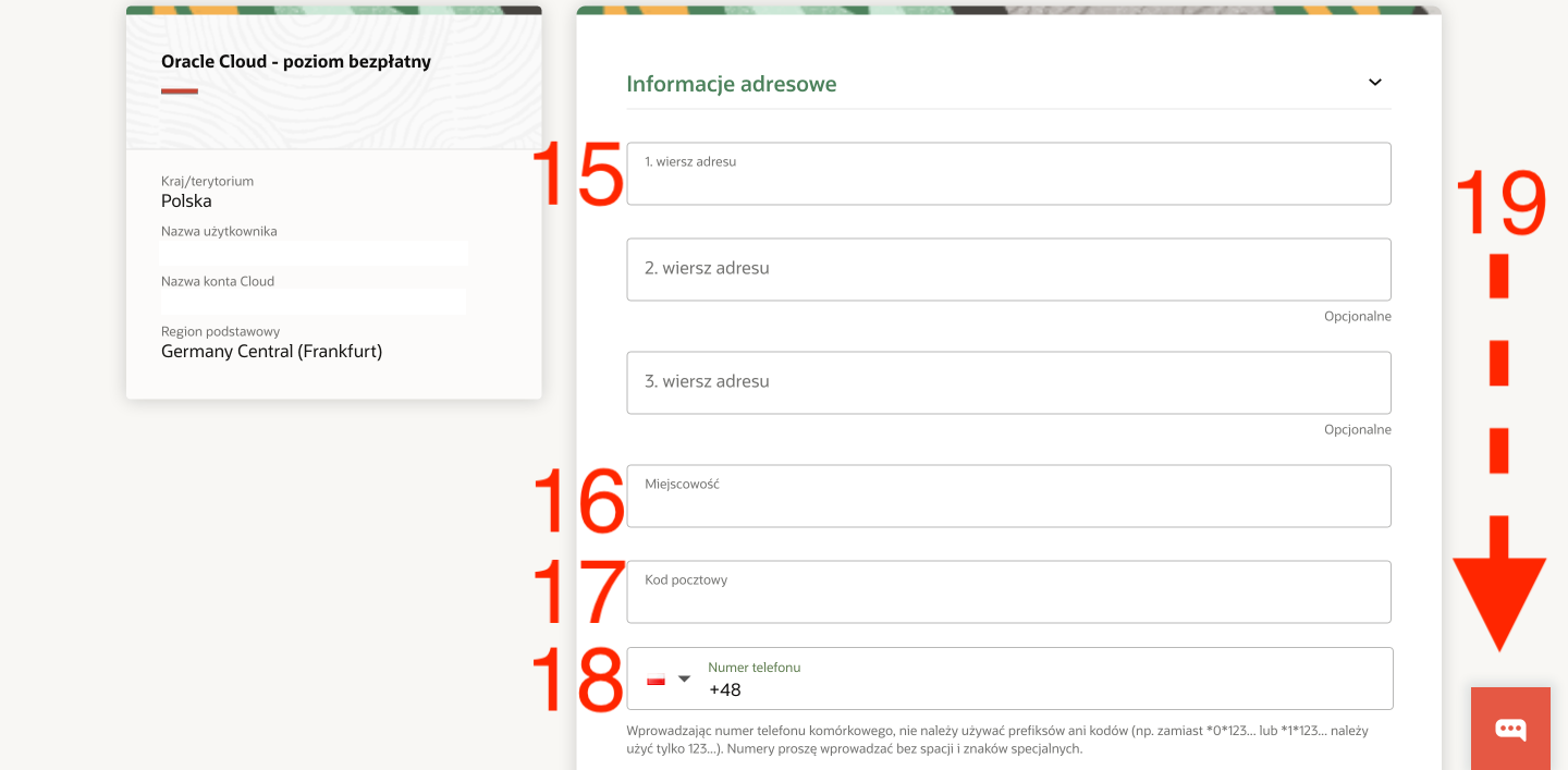 Następna strona dotyczy danych adresowych, czyli podajemy adres zamieszkania [15], miejscowość[16], kod pocztowy [17] oraz numer telefonu [18]. Po wszystkim zatwierdzamy przyciskiem Kontynuuj [19].