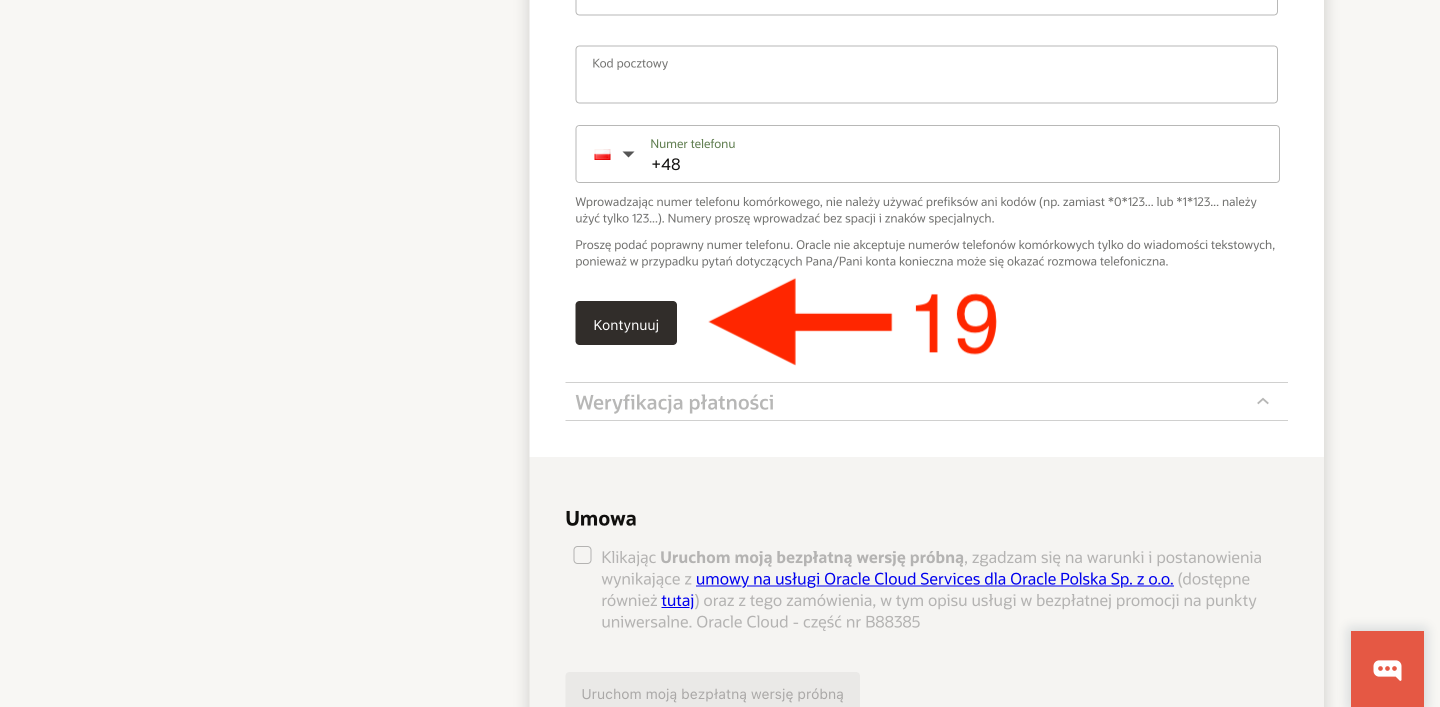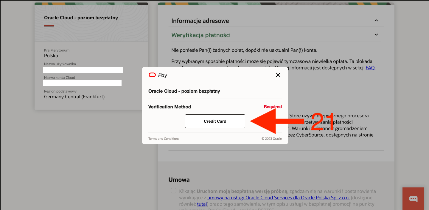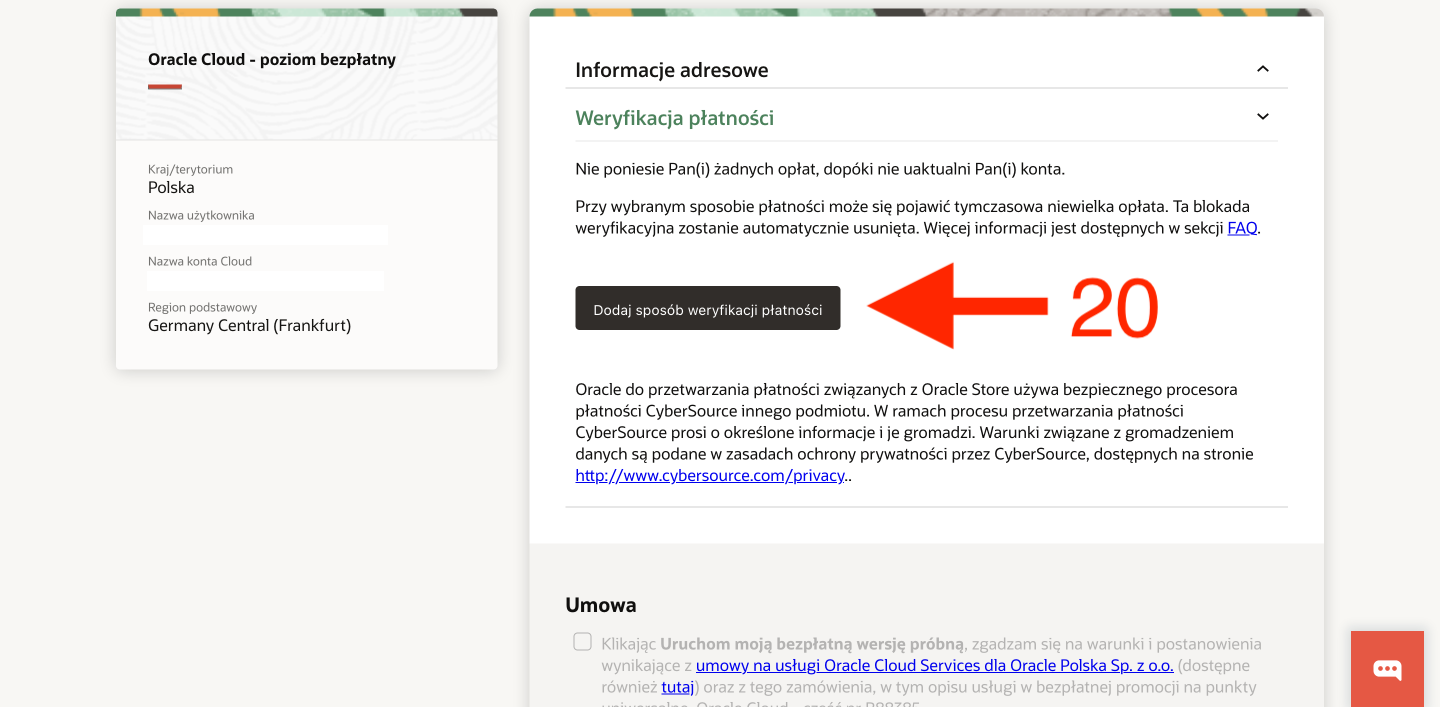 Sekcja dotycząca adresu zostaje zwinięta, a rozwija nam się weryfikacja tożsamości poprzez płatność kartą. Tutaj nie jestem pewien, bo tego nie sprawdzałem, ale zakładam, że dane karty na karcie muszą zgadzać się z tym co podaliśmy wcześniej. Piszę to, bo jeżeli czyta to np. nieletni, który wykonuje to wszystko za zgodą rodzica i skorzysta też z jego karty to musi podawać dane tegoż rodzica od samego początku, a nie dopiero teraz. Po naciśnięciu przycisku Dodaj sposób weryfikacji płatności [20] wyświetli się okienko, które chyba miało być oknem wyboru, a w praktyce daje możliwość wybrania tylko opcji Credit Card [21], co też oczywiście robimy. W tym momencie otworzy nam się formularz płatności wypełniony wstępnie danymi podanymi wcześniej, a na jego końcu znajdują się pola, w które należy wpisać numer karty, datę wygaśnięcia oraz numer CVV. Rozpoczynamy płatność i tutaj dla każdego banku będzie to wyglądać inaczej. Zakładam, że dla większości będziemy musieli potwierdzić tę transakcję na telefonie lub w serwisie transakcyjnym. Proces weryfikacji jest standardowy i polega na tym, że Oracle pobiera nam kwotę w wysokości ok. $1 (w trakcie gdy ja to robiłem było to 4.80 zł) i następnie po sekundzie zwraca nam tyle samo. W większości banków transakcja od razu traktowana jest jako nieważna i w ogóle nie pojawi się w billingu. Muszę też dodać, że Oracle jest dość wybredne jeżeli chodzi o akceptowanie niektórych kart, co potwierdza się w opiniach, które można znaleźć w Internecie. Wirtualne lub tymczasowe karty raczej na 100% zostaną od razu odrzucone. Tak samo podobno problem jest ogólnie z Revolutem. Ja próbowałem na karcie z mBank i nie poszło, więc za drugim podejściem skorzystałem z Citi Banku i przeszło. Po pomyślnej weryfikacji otrzymamy zielone okienko z napisem Thank you!, które zamykamy przyciskiem Close [22].