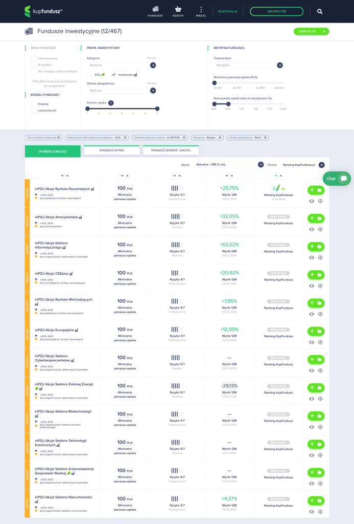 Przy takich ustawieniach odfiltrowanych zostało tyle pozycji, że zostało jedynie 12 z 467 i tak się składa, że wszystkie są funduszami z oferty inPZU (TFI PZU S.A.), które jako jedyne posiada opłaty za zarządzanie na poziomie 0.50%, co jest szalenie atrakcyjną ofertą, którą zawojowali rynek patrząc po wszystkich aktualnych zestawieniach najlepszych TFI.