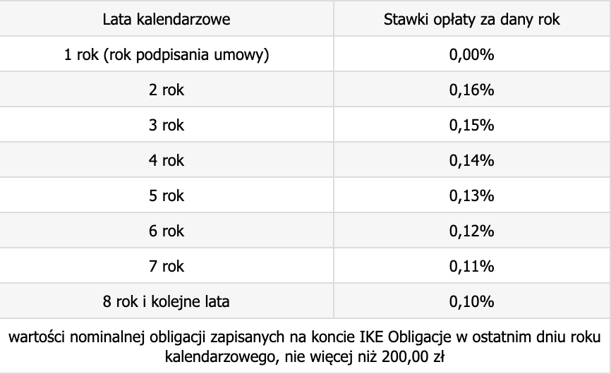 Warto też wspomnieć, że IKE-Obligacje nie jest produktem bezpłatnym, więc w zakładce Konto IKE-Obligacje -> Dane Konta IKE-Obligacje znajduje się jeszcze drugi numer konta podpisany Numer rachunku do opłat, na które należy uiszczać opłaty za prowadzenie. Prowizje są podane w poniższej tabeli. Trzeba powiedzieć, że jest to jeden z najtańszych produktów w zakresie IKE.
