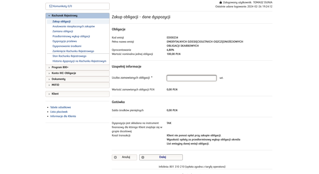 Tak wygląda serwis transakcyjny do zakupu obligacji w ramach Rachunku Rejestrowego: