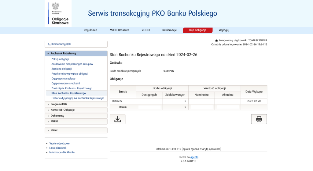 Pomyślnie kupione obligacje pojawią się w zakładce Rachunek Rejestrowy -> Stan Rachunku Rejestrowego.